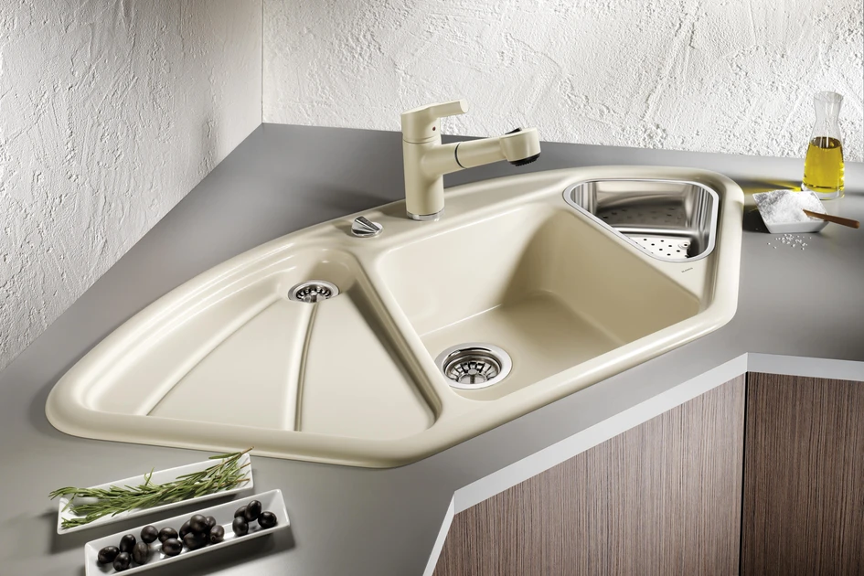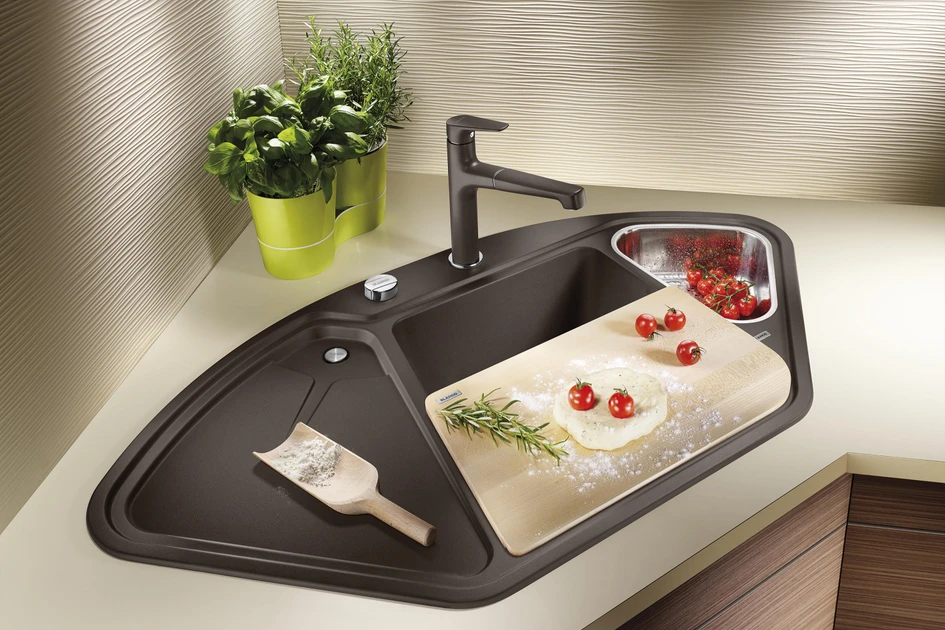 As sinks need to be a minimum distance from electrical points and appliances, and require surface space on each side to collect soiled and sparkling cookware at opposite ends of the process, their location and positioning options can be fairly limited – especially in small kitchens. Using up the awkwardly unusable counter space and awkwardly unreachably cabinet space in a kitchen’s corner, however, corner sinks like Blanco’s Blancodelta sink offer the functional advantage of tucking the sink and its connecting pipework neatly out of the way.© Architonic