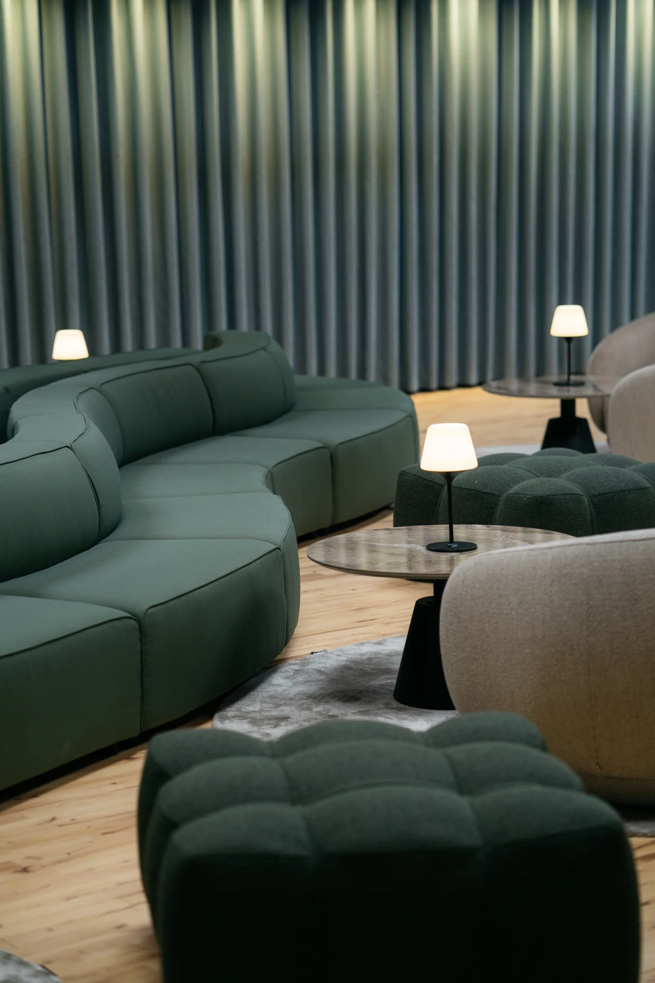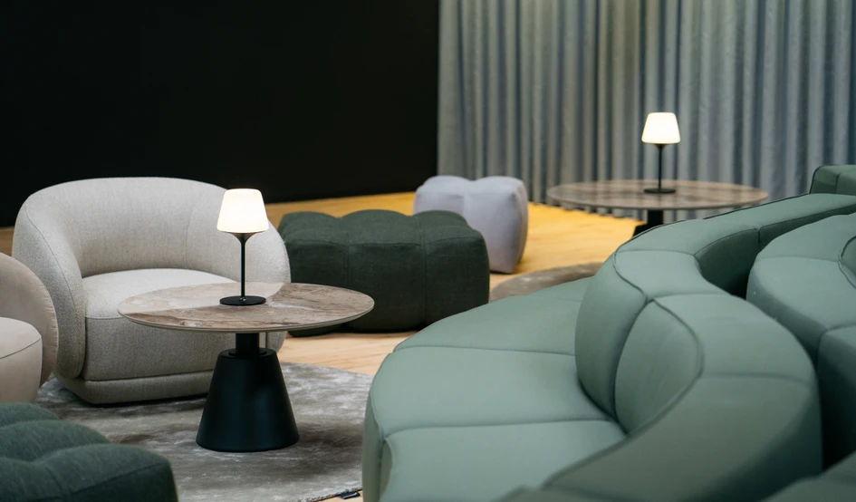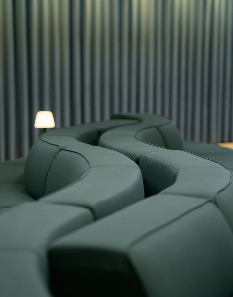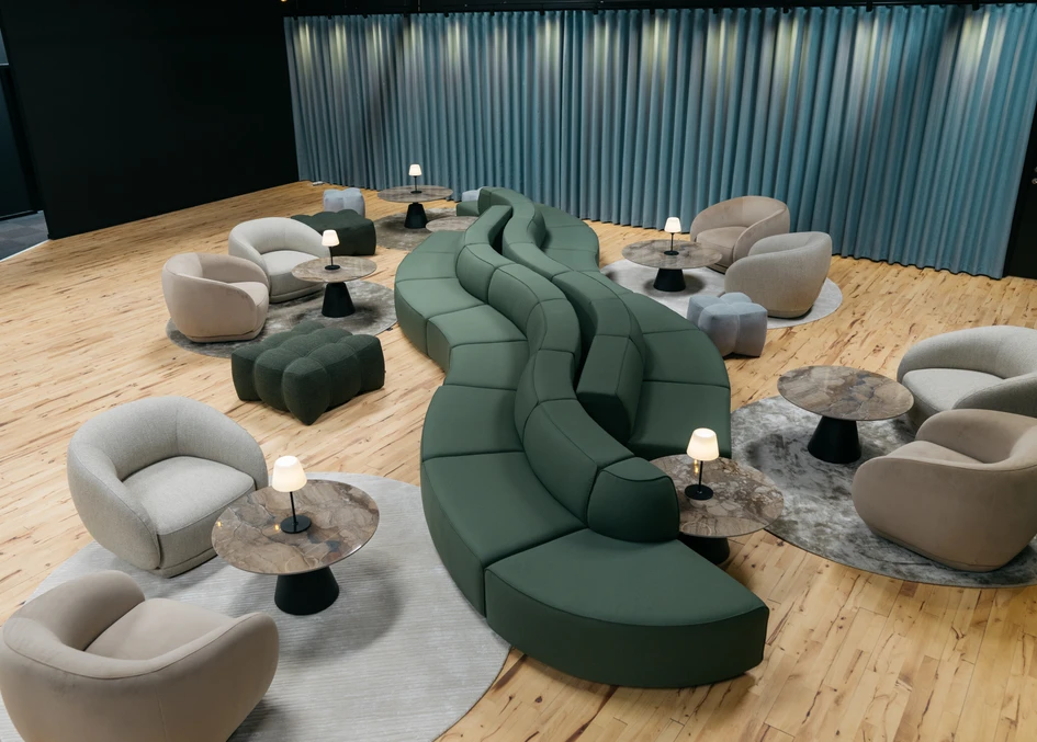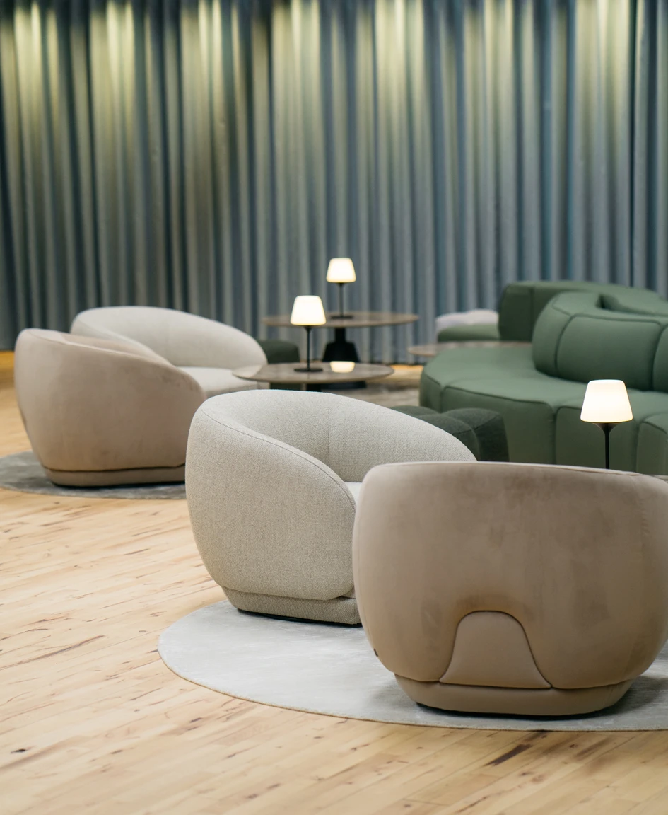 BoConcept’s Carmo snake sofa formed the essential centrepiece to this arrangement: the modules of the sofa softly curving to subtly carve out more intimate spaces, counteracting the scale of the space beyond. The deep comfort of the Gabriel fabric and the foam cushioning was ideal for recharging after extended sessions. In addition, modularity was key, because the client sought a flexible seating arrangement that could accommodate different settings, all whilst seamlessly integrating into the available space.A group of cocooning Bolzano armchairs encourage ‘togetherness’ with joyfully swivelling bases for shifting conversations and viewpoints