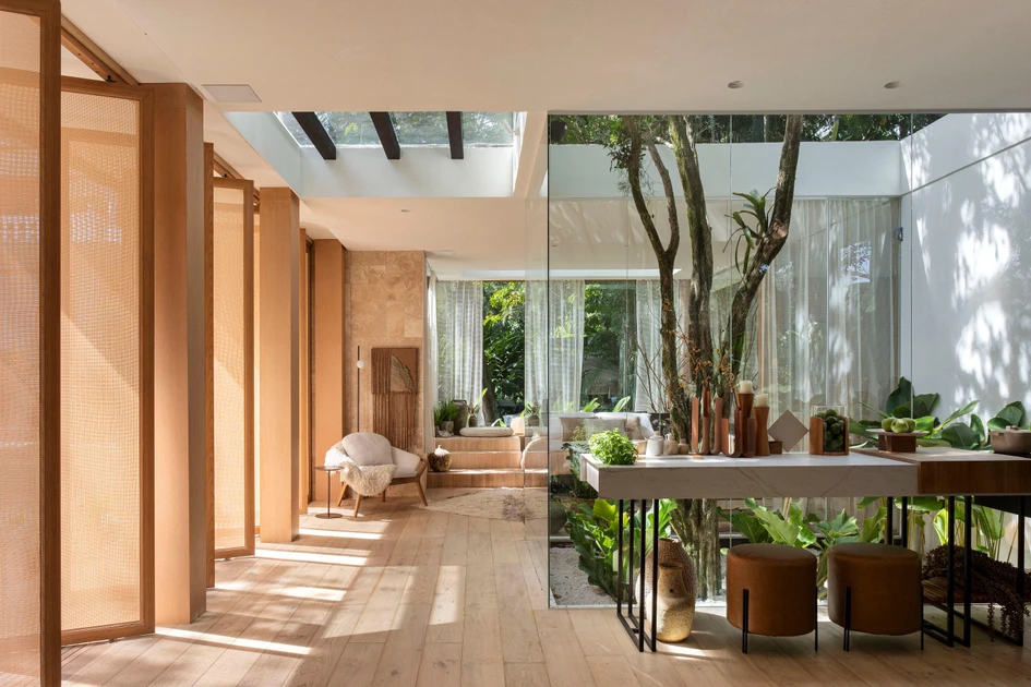 'Integrating with the tropical climate is a key aspect of contemporary Brazilian architecture and interior design, and this show house in Rio’s Botanical Gardens converses with it at every turn. From the controlled acceptance of sunlight, ventilation and rainfall through its main facade of pivoting panels and an indoor terrarium at its core, to the natural textiles and aesthetics of its materials, this house is at one with the surrounding nature. And with the northern hemisphere well into its colder, darker half of the year, this reminder of its vegetative beauty offered me pure escapism.'