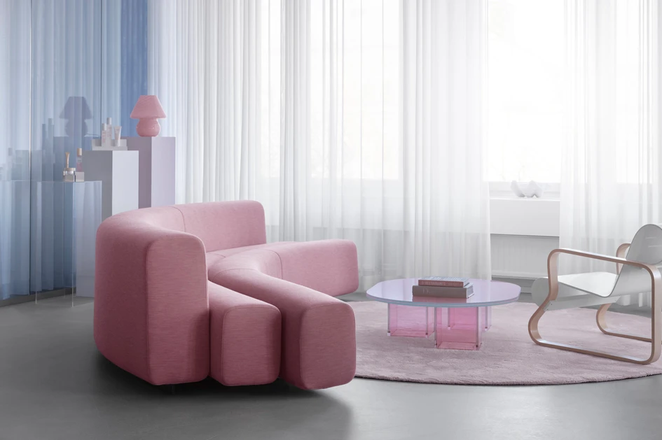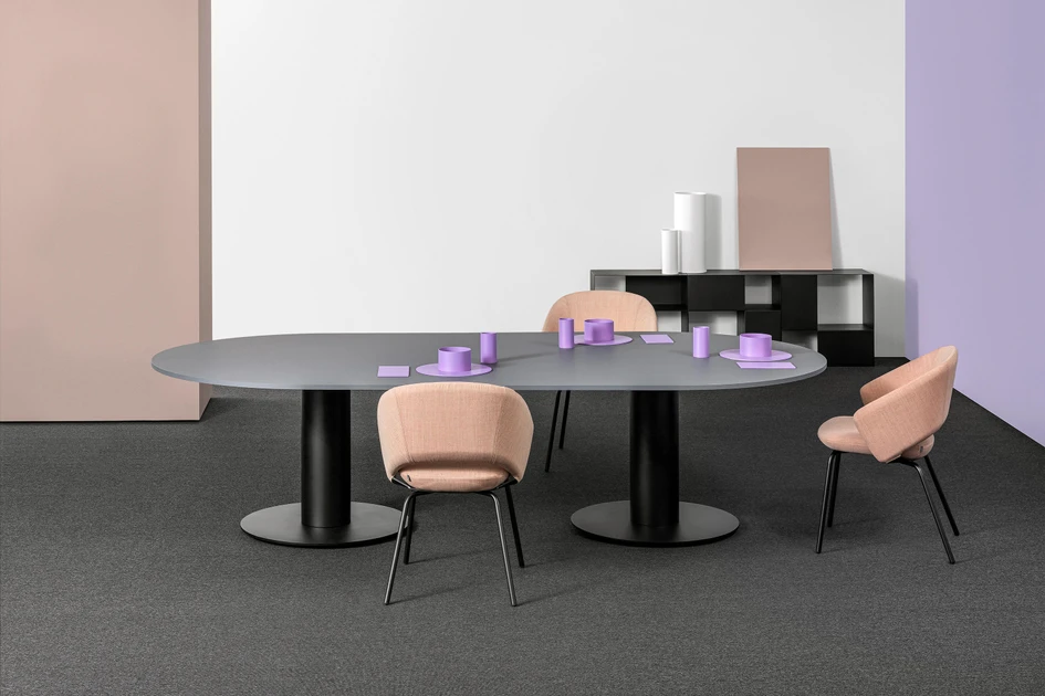 Even in more formal settings such as offices, designers can use the pinkvolution to give workplaces more colourful and comforting, yet still neutral, colour palettes. This head office and showroom for a cosmetics brand, for example, blends pastel pinks and lilacs with neutral whites and earth tones in curved shapes and draped fabric backdrops for a stress-free atmosphere. The Icon office chair, for example, for office furniture brand Mara, is one such product designed for the workplace that combines its curved form with pastel fabric options, including pink. WYE’s Lowboard sideboard, meanwhile, from the |chamfer| collection is multifunctional in its simplicity and able to feature in many pastel-based settings.