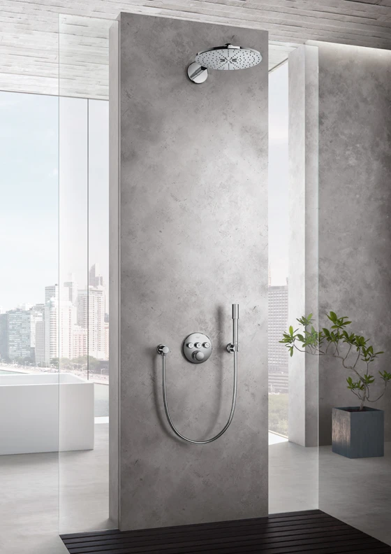 Die Grohtherm SmartControl Thermostateinheit ebenso wie der Duschkopf und die Euphoria Handbrause sind in quadratischer oder runder Ausführung erhältlich und fügen sich so in jeden Badezimmerstil ein