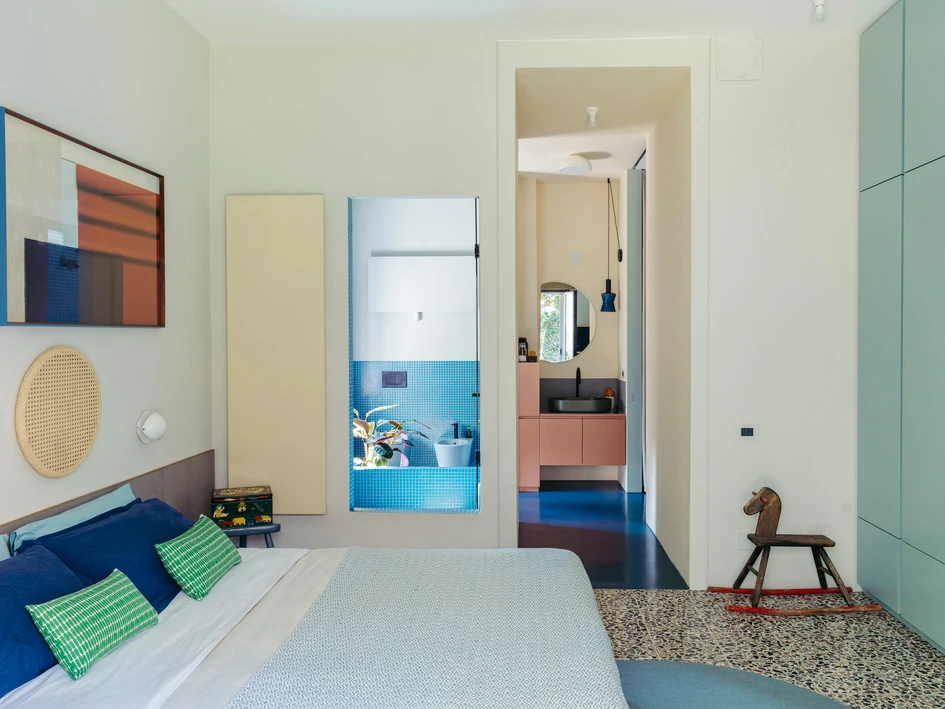 Die in die Wand eingelassene Duschtür von Casa Tre Viste verbindet das Schlafzimmer mit dem Duschraum im Bad (oben), und die digital bedruckten Paravents von Samo (unten) dienen sowohl als Abdeckung als auch als Dekoration. Foto: Mattia Balsamini (oben)