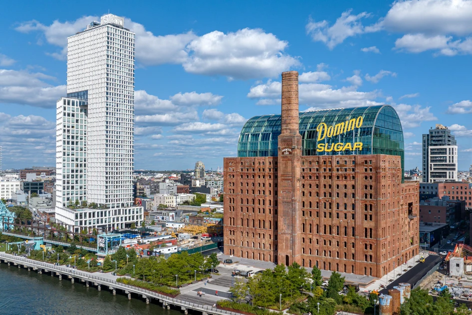 Die 1882 erbaute Braunsteinfassade und der dominante Schornstein der Domino Sugar Refinery sind ein Wahrzeichen der Skyline und des Hafens von Brooklyn und wurden 2007 aufgrund ihrer historischen Bedeutung unter Denkmalschutz gestellt. Aufgrund der enormen Ausmasse der erforderlichen Anlagen weist die denkmalgeschützte Fassade der offenen Fabrik jedoch unregelmäßig grosse Stockwerke auf, die nicht an die heutigen Standards angepasst werden konnten.