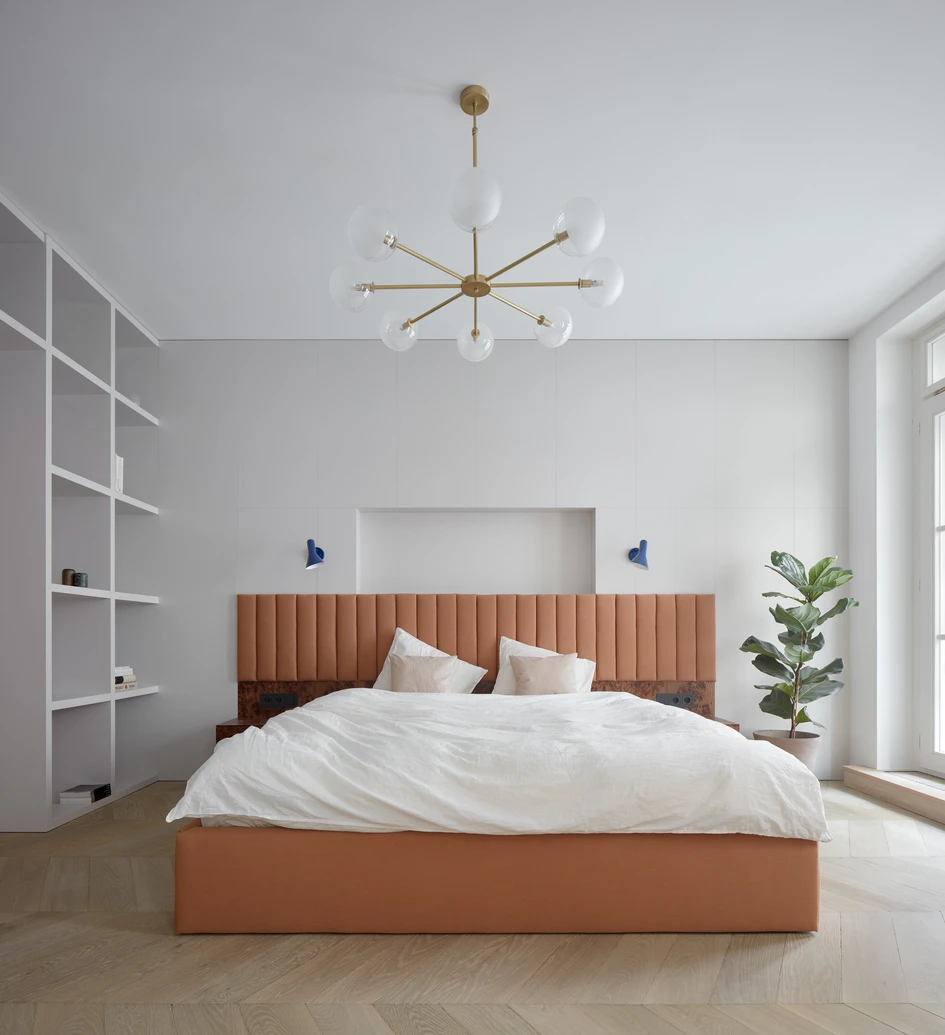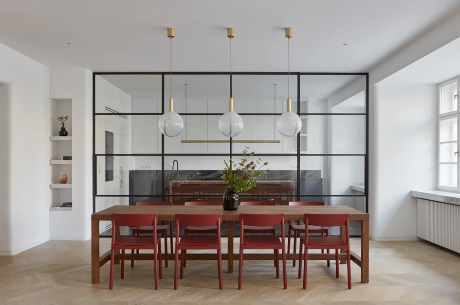 The generous space asked for a generous approach. The apartment is located in the Old Town of Prague and with its 250 sqm extends on a full floor of a refurbished residential building from late 1920’s. The architecture of the building suggests a stylistic shift from art deco to early functionalism, which became the inspiration for our interior concept. It is based on timeless materials, refined details and a lot of bespoke and in-built furniture. The aim as well as the brief was to provide unpretentious, almost minimalistic contemporary living, striving for simplicity while offering a diversity of atmosphere and experience. The main welcome is just the clean architectural space itself filled with daylight, while at the second glance, the interior offers moments of surprise and discovery – like an advent chocolate calendar, where opening some doors leads each time to a different taste or mood… here a new materiality can be revealed - like a dark veneer wardrobe, a brass-clad bar or a whole red powder room.
