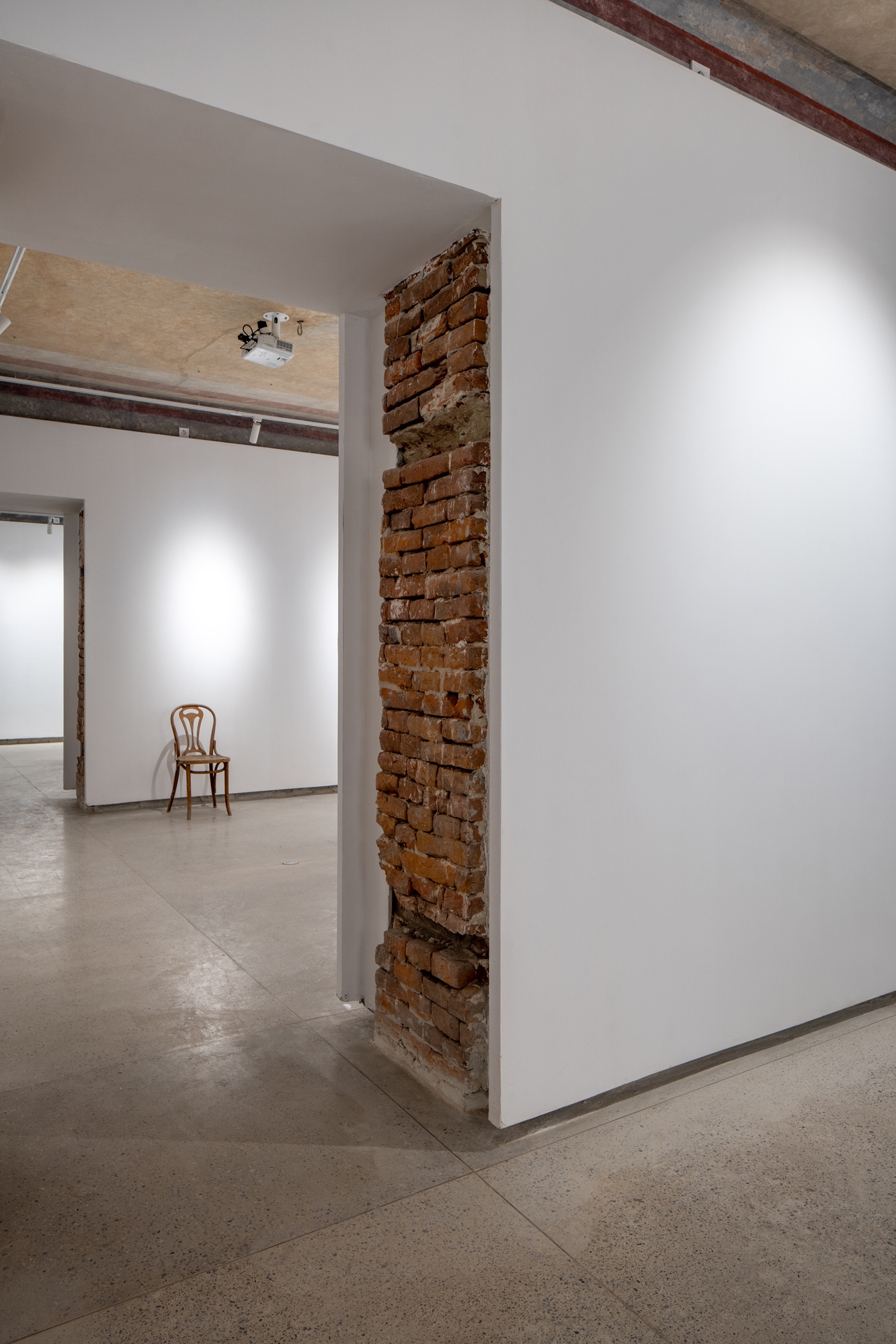 The gallery occupies 30% of the space. The white cube aesthetic is critical there, so we hanged a drywall on a metal stud frame, so that the walls could breathe, giving a white and smooth space to visitors while keeping the authentic ceiling opened and untouched.
