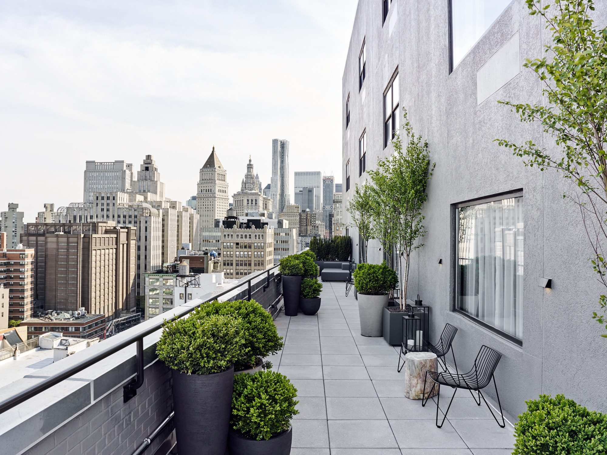 Rooms feature an art object, a plaster wall ceramic created by the artist Katie Yang, and a sensuous new lighting collection designed by SPACE Copenhagen exclusively for 11 Howard. The rooms are soft and inviting. Beautiful materials such as porcelain tile, marble countertops, and brass trimmings selected by SPACE Copenhagen line the in-room bathrooms.
