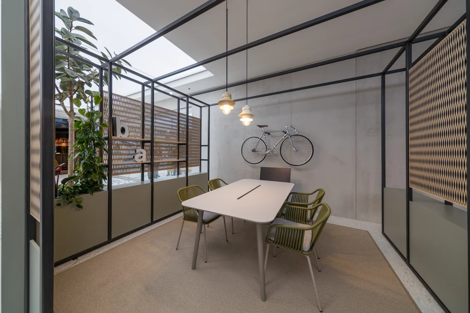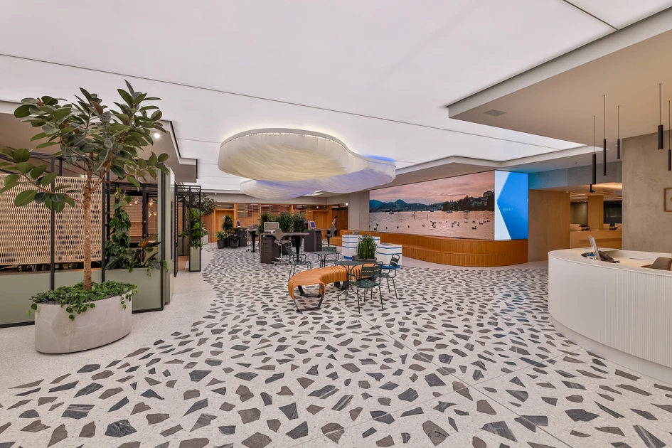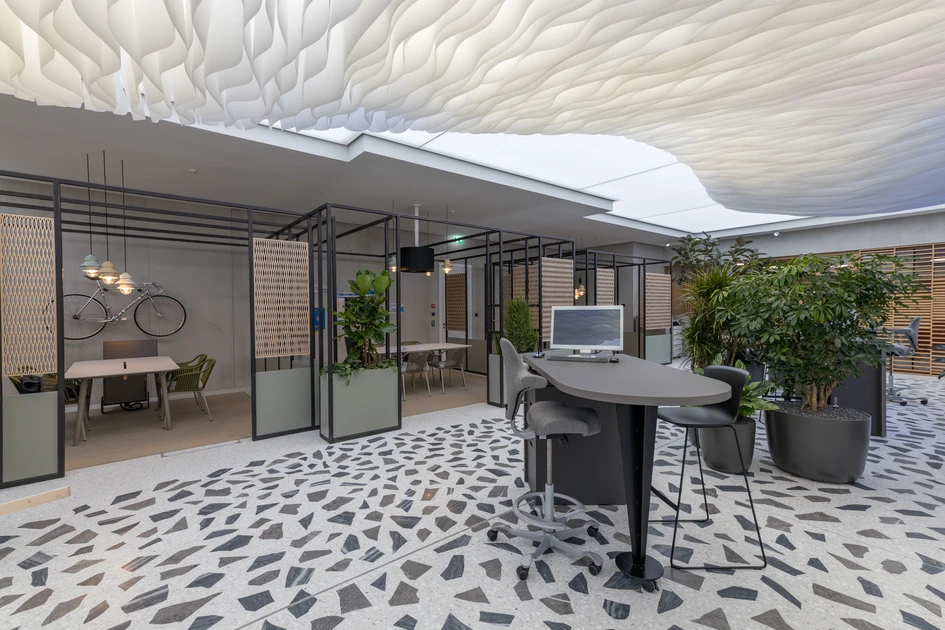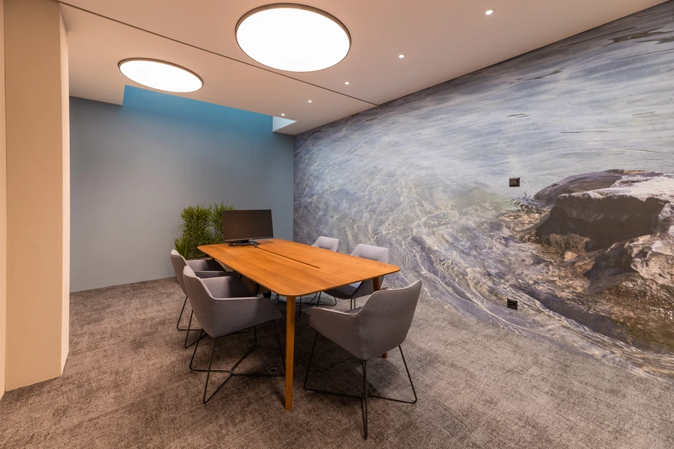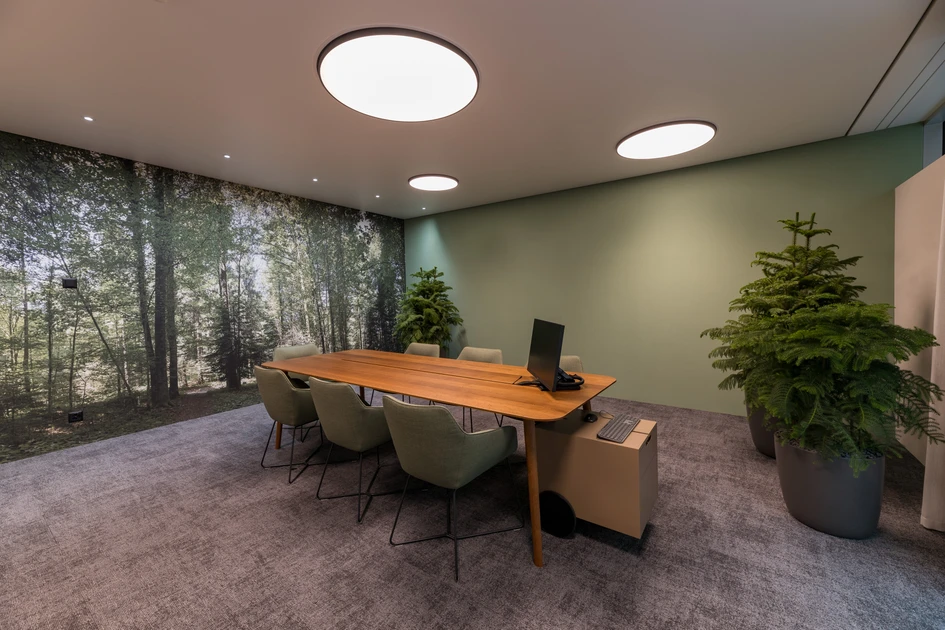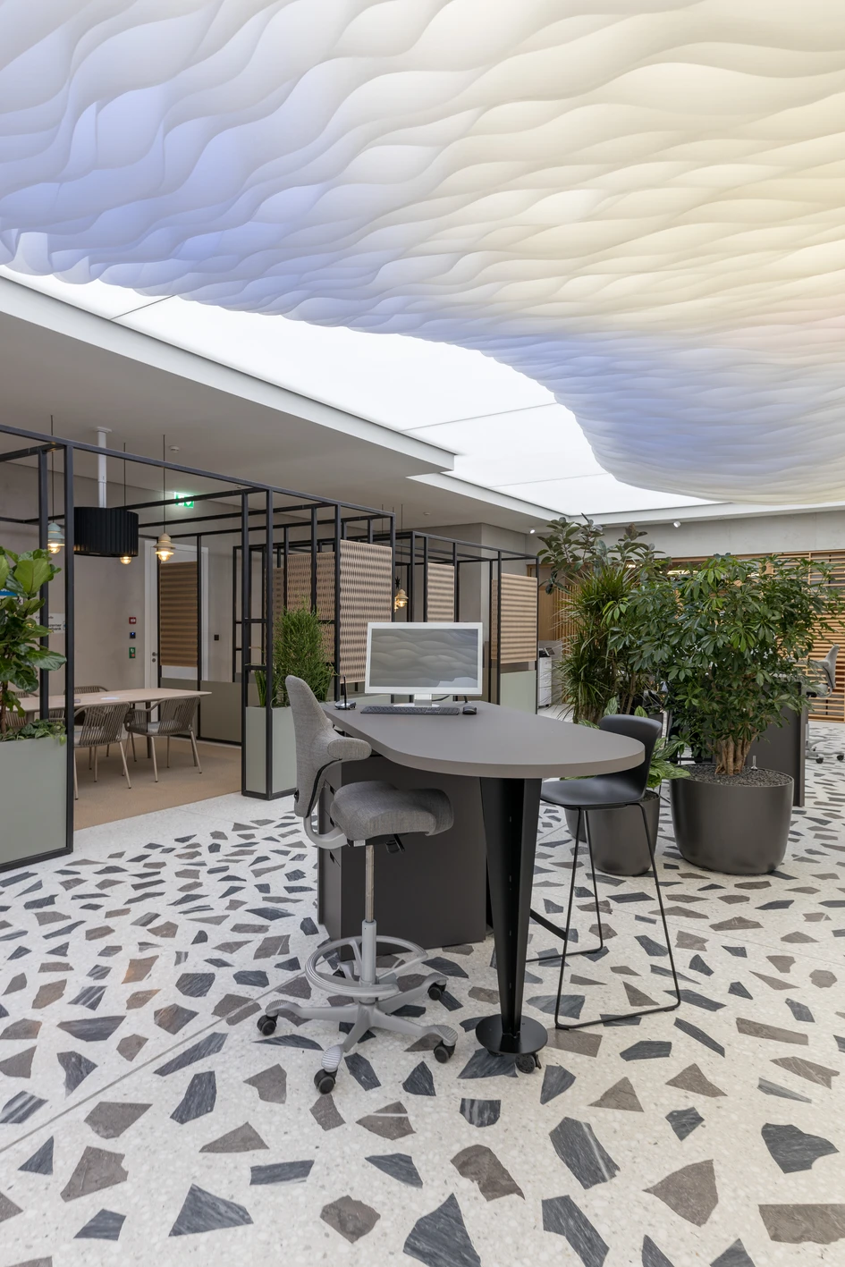 Inspired by the Neustadt-Hirschmatt quarter, we developed the “Quarter within a Quarter” concept that integrates elements of the diverse neighbourhood into the design. Among the new features is a large “cloud” on the ceiling that counteracts the hall-like feel of the space and reflects the actual weather conditions in Lucerne. The hall accommodates consultations in various places: at mobile high tables, semi-private pergolas and consultation rooms. The pergolas are inspired by the typical perimeter block buildings in the neighbourhood; the consultation rooms by four popular city spots. The cement look of the walls and numerous plants emanate the feeling of being outdoors.