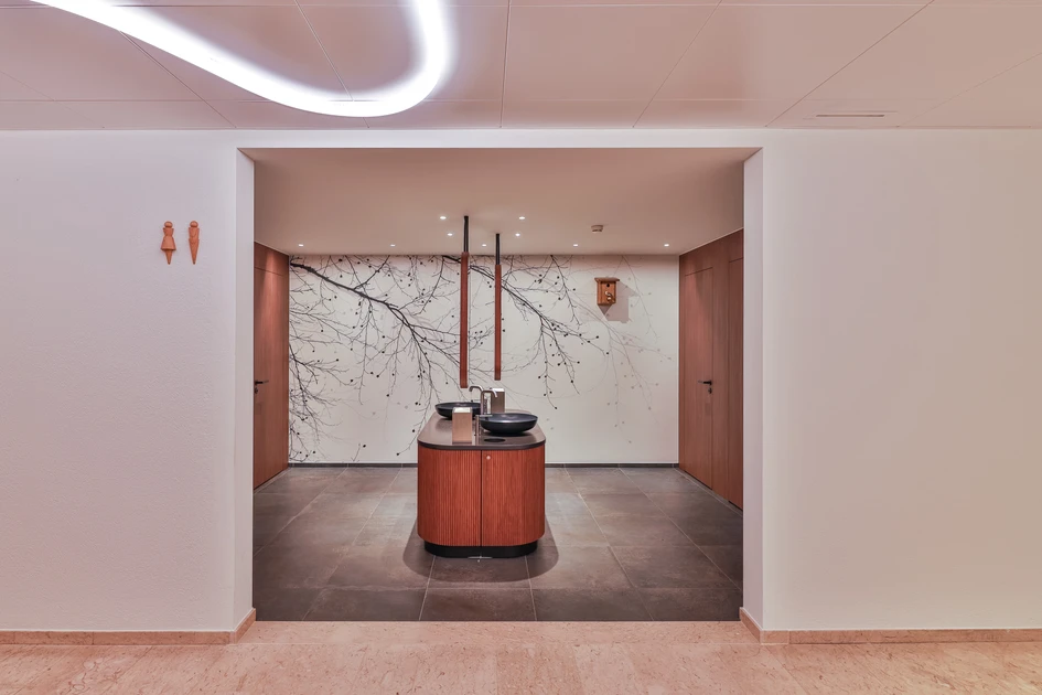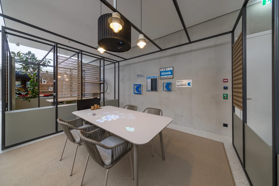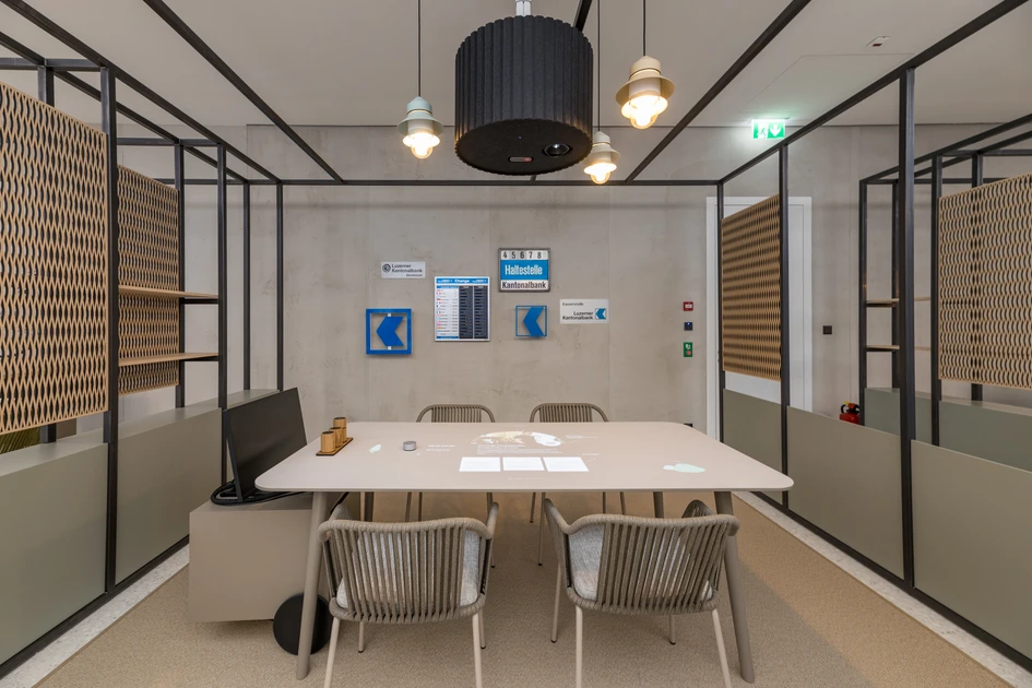 Since successful completion of the “Quarter within a Quarter” interior architecture project in late 2023, the customer service hall of the LUKB headquarters has been basking in its new glory. The hall, originally built in 1973, was last remodelled in 2007. The main aim of the latest redesign was to break up the cold character of the space.
