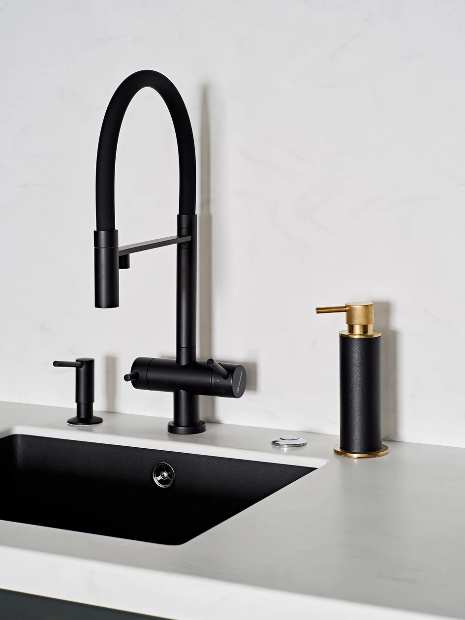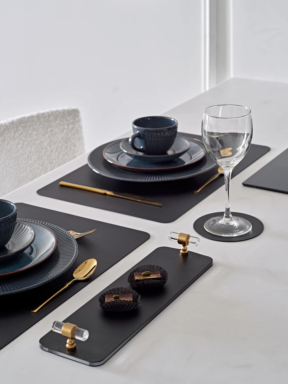 The kitchen is enhanced with a curated selection of ADJ STYLE accessories: a soap dispenser, Snob Boxes, Mini Bottega baskets, fruit bowl, and salt & pepper grinders help keep everything tidy. For table settings, placemats, coasters, and trays add a refined, cohesive aesthetic.