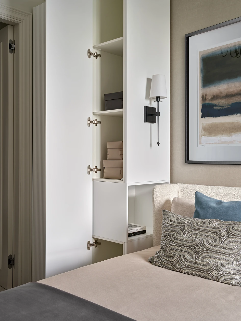 The bedroom features neutral tones to create a serene and uncluttered feel. Carefully chosen ADJ accessories maintain a minimalist elegance without overloading the space.