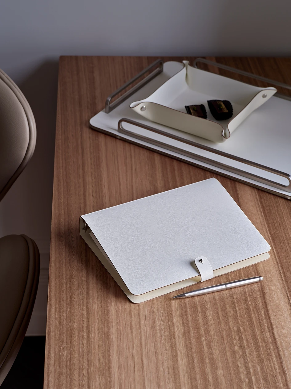 The home office is designed with future transformation in mind — ready to become a children’s bedroom if needed. Currently, it’s furnished with ADJ accessories that support both style and functionality: planners, a desktop tray, a wastebasket, and multi-use containers maintain order and elegance.