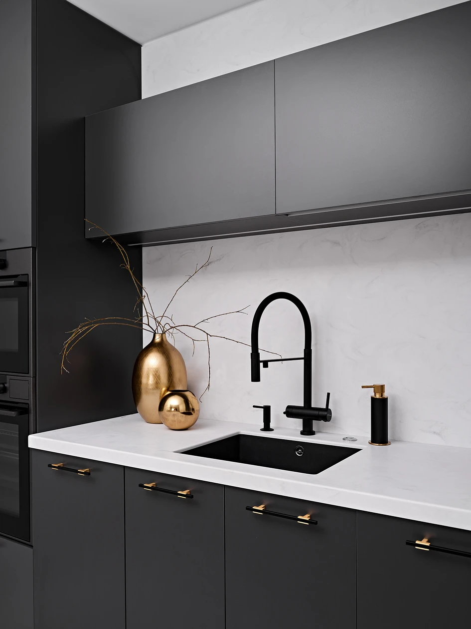 The bathroom stands out for its bold black vanity unit, accentuated by golden details. ADJ’s panna cotta and gold-finished dispensers complement the mirror and faucet, adding a touch of understated luxury.