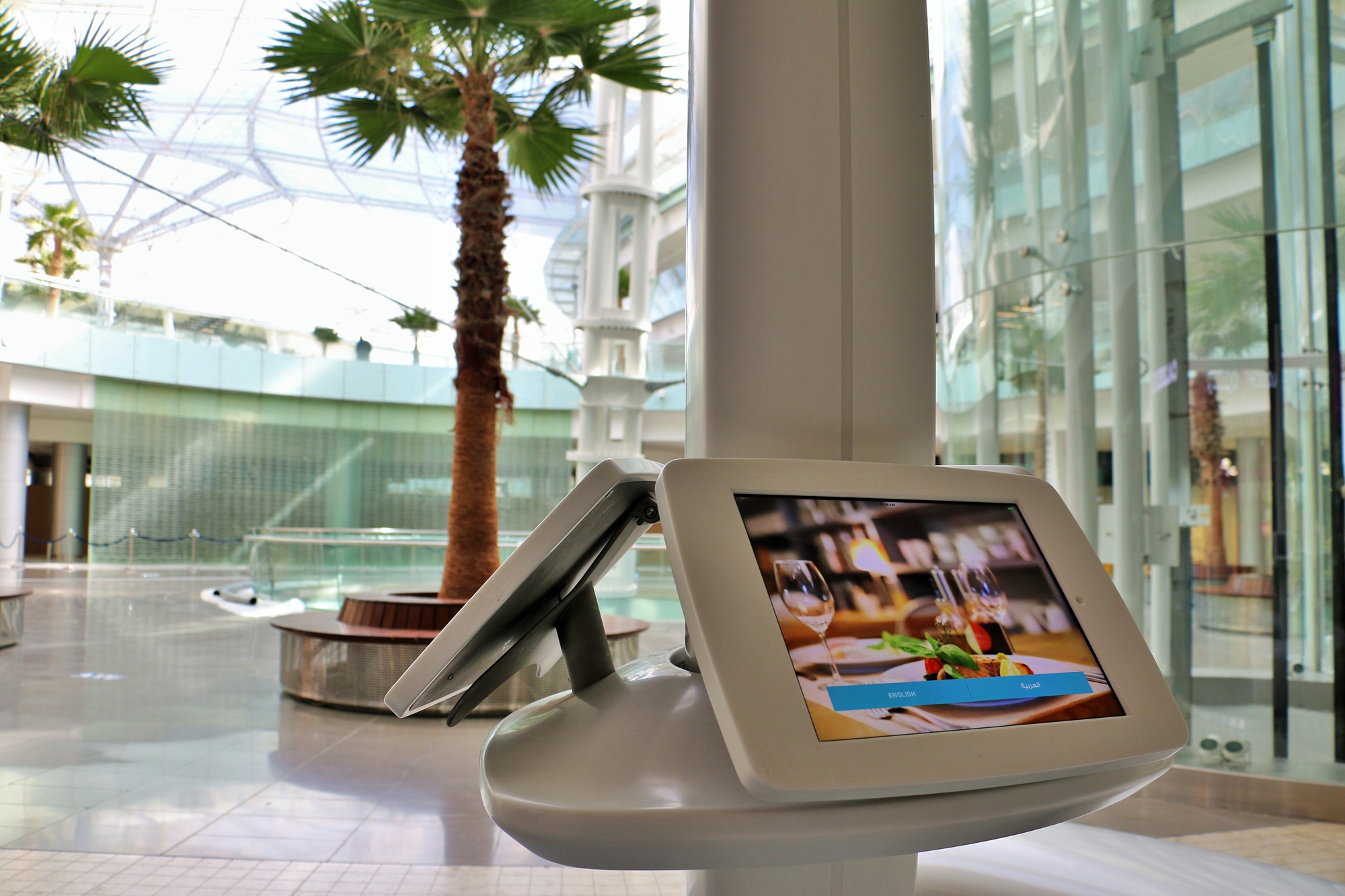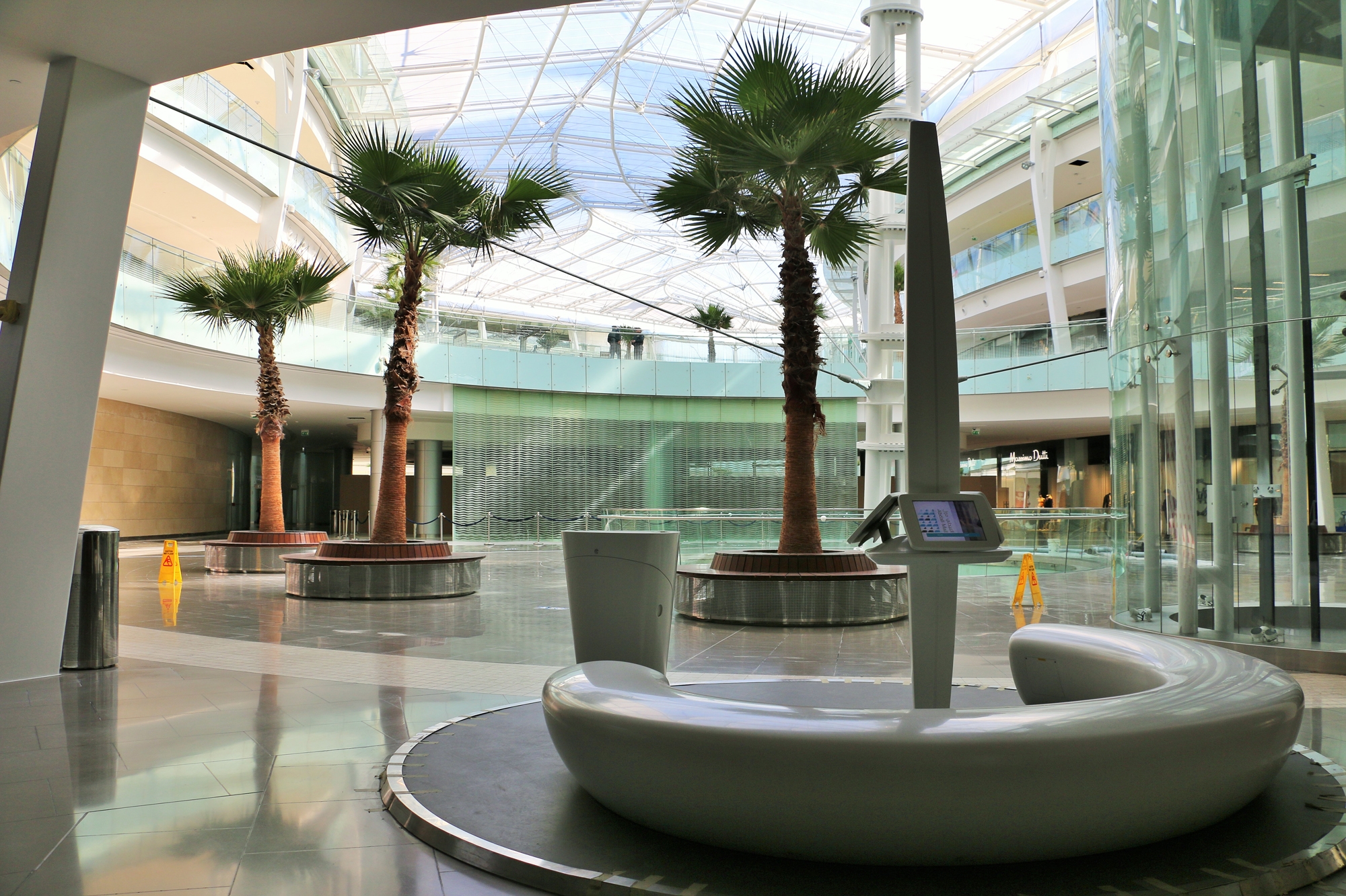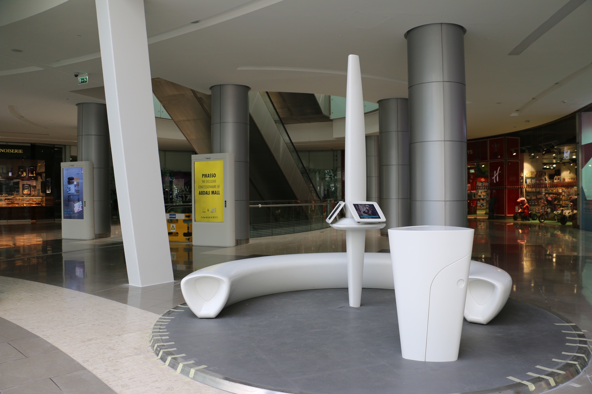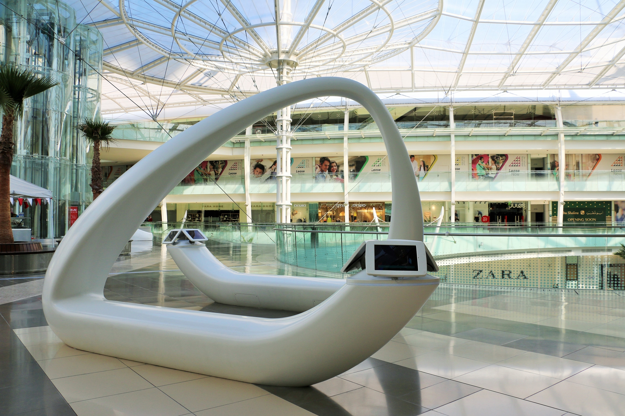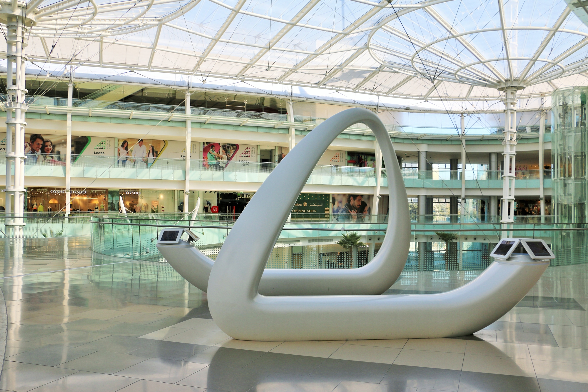 In 2016, the Abdali Mall opened a spectacular shopping centre in the new downtown district in the heart of Amman, the capital of Jordan. On five floors with a gross area of approximately 227,000 square meters, it comprises countless shops and several indoor and outdoor restaurants and leisure facilities. The interior of the mall is impressive with its dynamic design ambience; individual floors flow like sweeping balconies around several atriums and light wells. Waterfalls plunge several floors into the depths, and plenty of natural light falls into the interior over an impressively vaulted glass dome. Rosskopf + Partner created unusual, three-dimensionally shaped lounge and media furniture as well as various signposts and information displays made of the solid surface material Avonite® in the colour Polaris to match the flowing architectural decor.