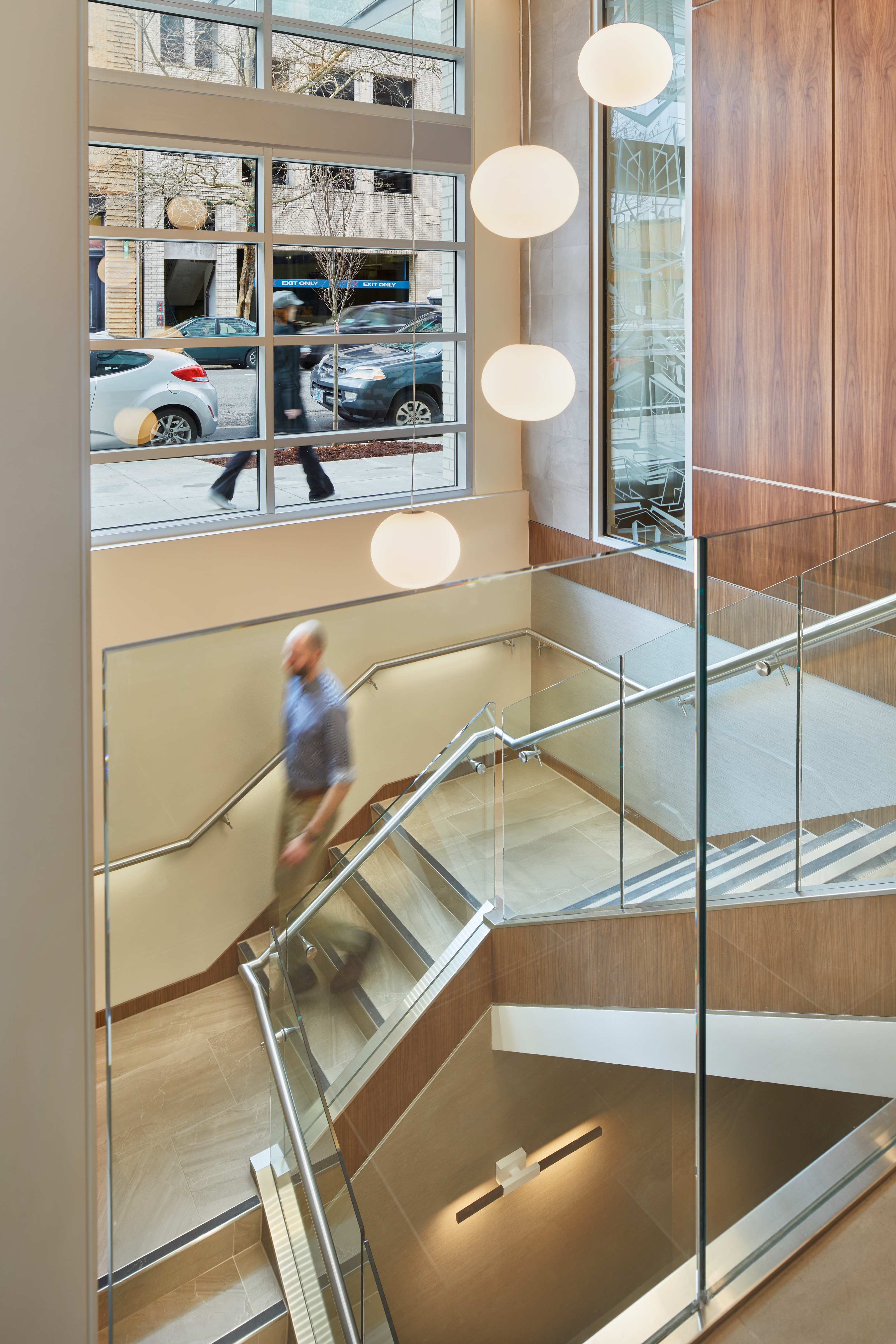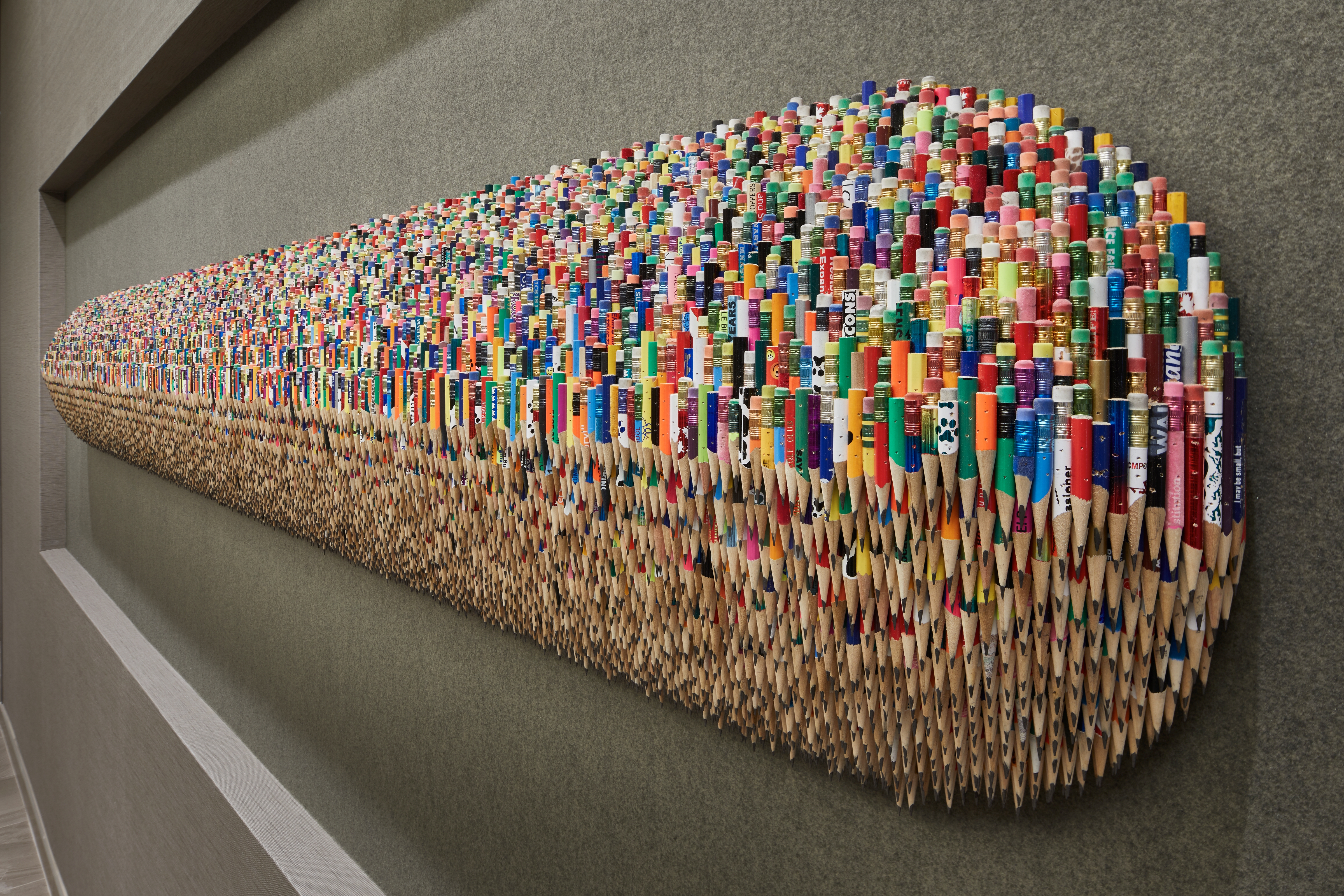 A giant, 11-foot-diameter, cross-sectioned tree made from cast aluminum opens to reveal an on-site coffee bar. Even the lobby staircase, wrapped in floor-to-ceiling, sandblast-etched glass totems (a tribute to the traditions of the indigenous people of the Pacific Northwest) becomes art installation. Pendant globe fixtures work their way throughout the ground floor and into lower level conference spaces, which receive a splash of color courtesy of a 10-foot-long sculpture by James Florschutz that is made of 6,000 redwood and cedar pencils.