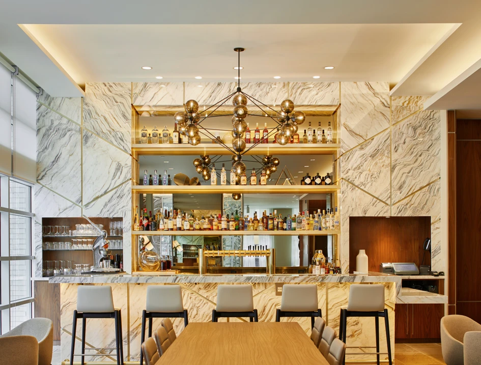The design exudes a masculine aesthetic. “The design takes its inspiration from a tailored men’s suit—sharp, masculine, and impeccably detailed,” SERA principal and interior designer Lisa Zangerle notes. The main floor’s signature space, the bar, features brass and bronze glass accents, which complement the geometric panels while purple veining in the marble adds a luxurious touch. “The bar is the sparkling cufflinks of the space,” Zangerle adds. In the adjacent lounge, fixtures, furniture, and materials balance the theme.