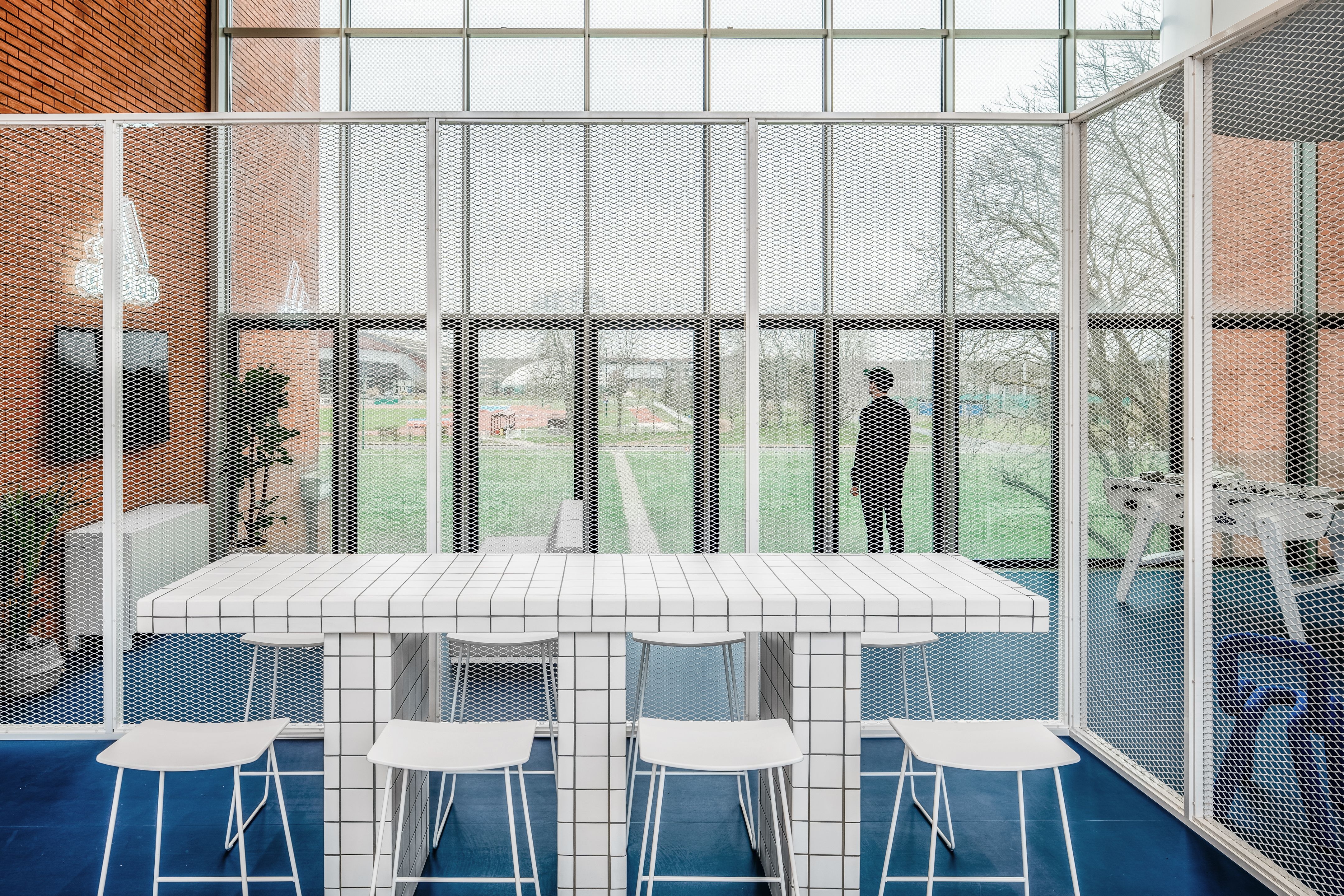 A large white expanded metal cage is installed in the center of the living house dividing the space in order to create different poles of activity: the idea being to offer young athletes opportunities for differentiated experiences but at the same time spaces conducive to appropriation. The large cage accommodates high tables for dinner or work. To its left is a play area and on the other a solarium in the form of multiple arches facing the view. Each zone thus created has its own design, its own shape but responds to each other by their shape, their color, or the choice of material. All these elements slide together without ever touching each other, like a large graphic playground; only the screw leading to the mezzanine disturbs the strict lines of the project.