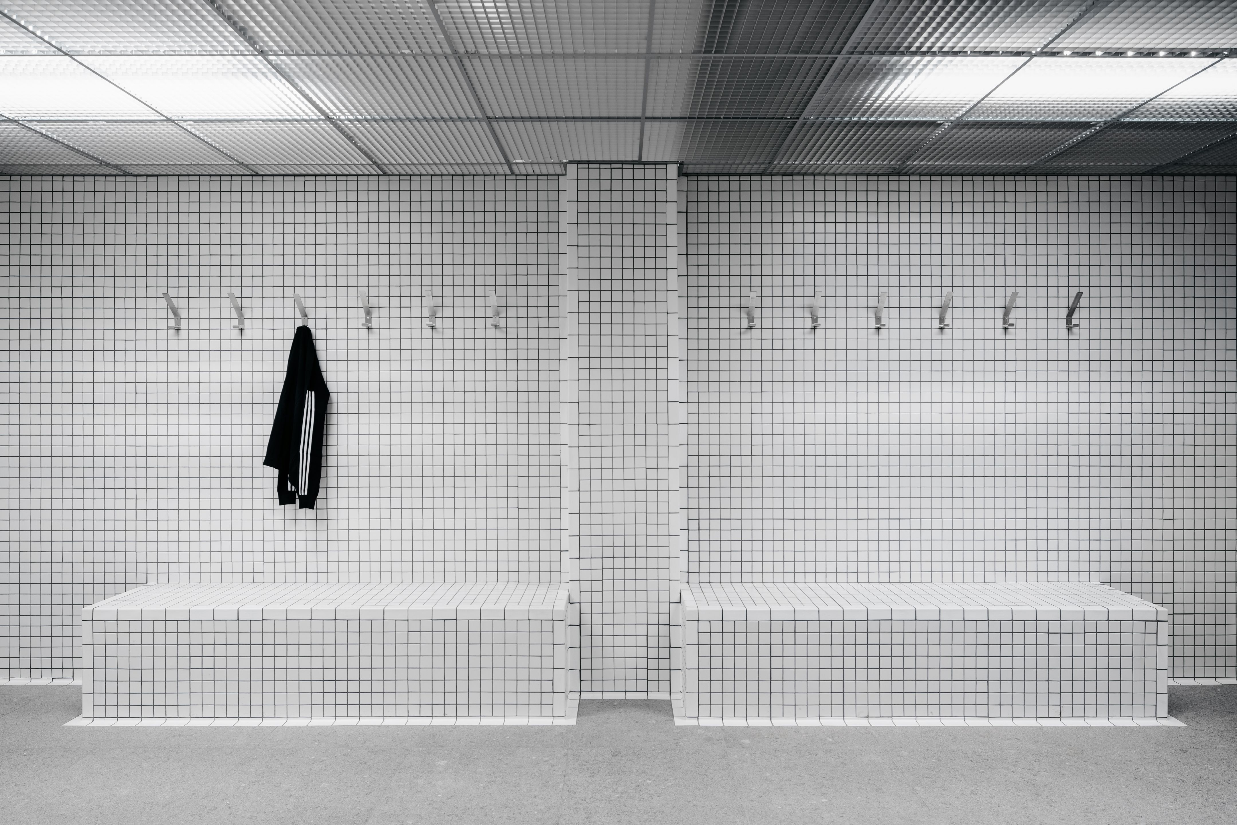 Ostermeyer Room. This meeting room is designed in coherence with the home of young athletes: blue floor, expanded sheet metal, white-tiled furniture. Corridor: the project includes the reorganization of circulation under the Halle Pajol: blue dominates. These spaces are designed immersively, only light and co-branding dissociate from the tunnel envelope. Locker rooms: here too immersion is sought but this time it is a matter that invades space. The first actor in the place is the 5x5 white tiles which confront the sandstone of the ground. This goes up along the wall. At the meeting of the two materials comes a blue signature blade representing the partnership. The addition of a mirror and a metallic frame to the ceiling ends up disturbing the physical limits of this space conducive to concentration.