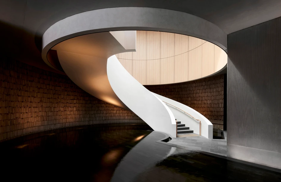 The interior scheme is a continuity of minimalist design. Simple forms and a circular motif are adopted throughout and articulated with curved walls, rounded windows, and large skylights that punctuate the space illuminating the interior. Celebrating the process of arrival, a spiral stair rises from a reflective indoor pool as a sculptural feature and as a mechanism to demark the public and private spaces.