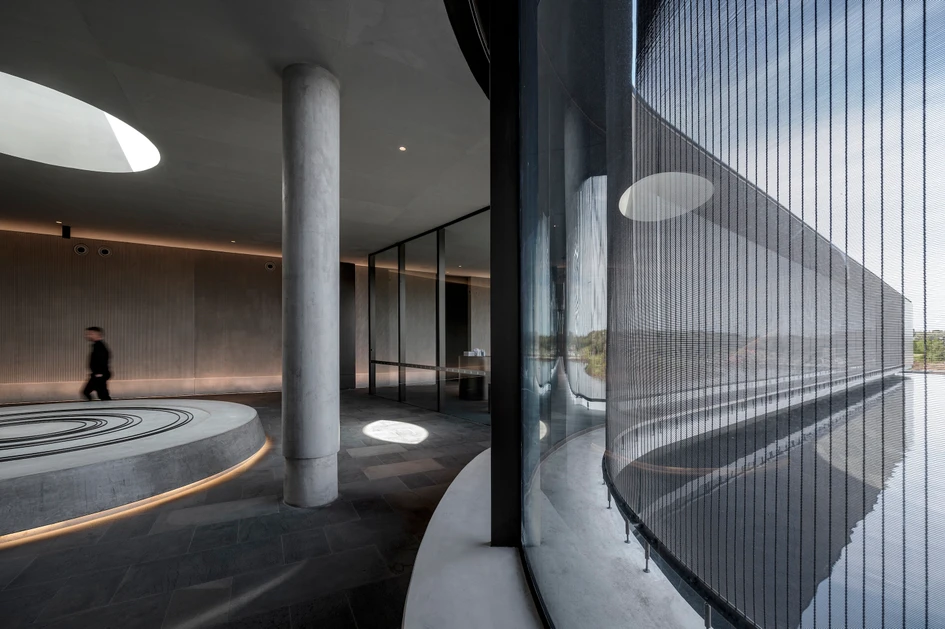 Taking advantage of the natural fall in the land, the main building emerges from the gentle undulation of the terrain. The form is characterized by raw concrete allowing the organic sensibilities of the site to be the hero and cultivate a language between built form and landscape. The façade’s ribbed texture, bronze glass, and metallic finishes add an of element robustness and minor intervention amongst the natural surroundings. The curved concrete walls express the purity of form, delineating the spaces and cutting through the landscape creating sunken courtyards and curating opportunities for light and shadow.