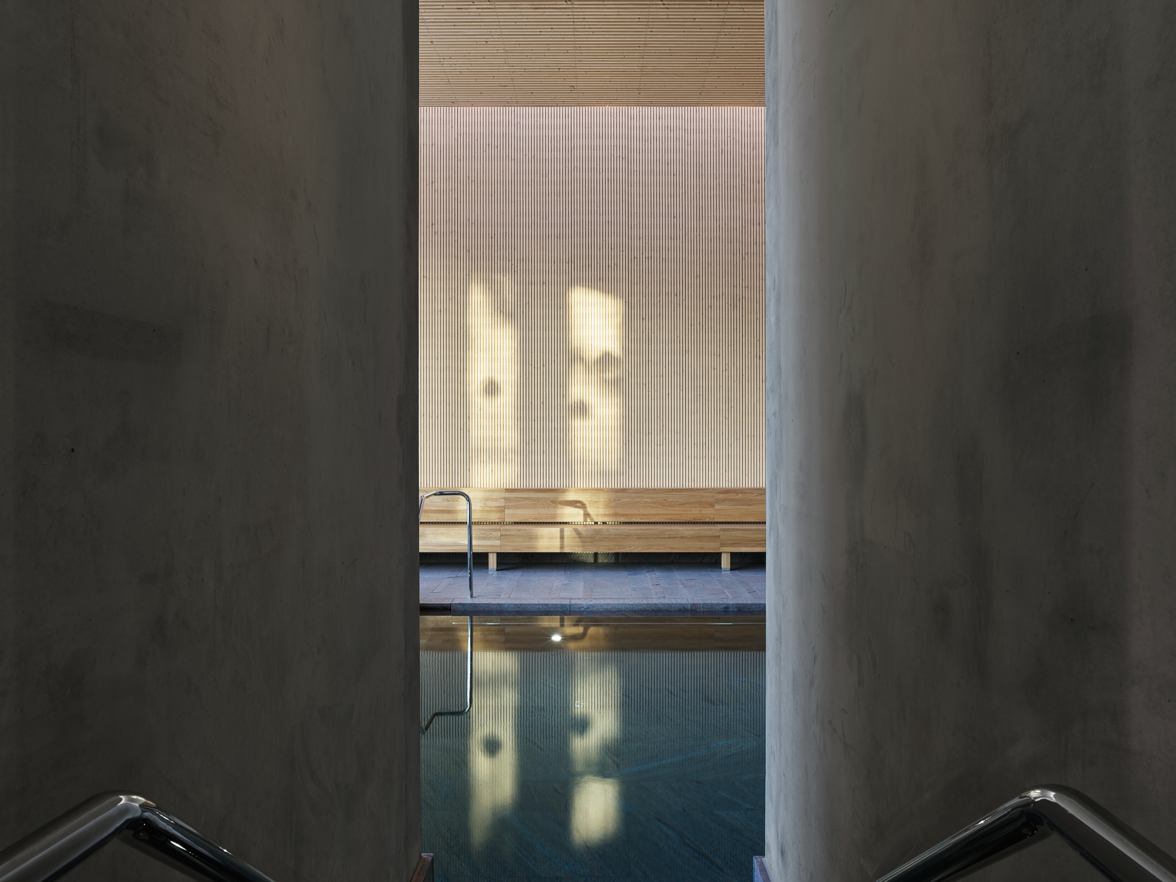 Andrum comprises a number of connected rooms with various features such as e.g. bath, sauna, rain, waterfall and steam. There are rooms for resting throughout the building, as well as rooms for spa treatments. There is contact with the park from a separate terrace toward the southern side.