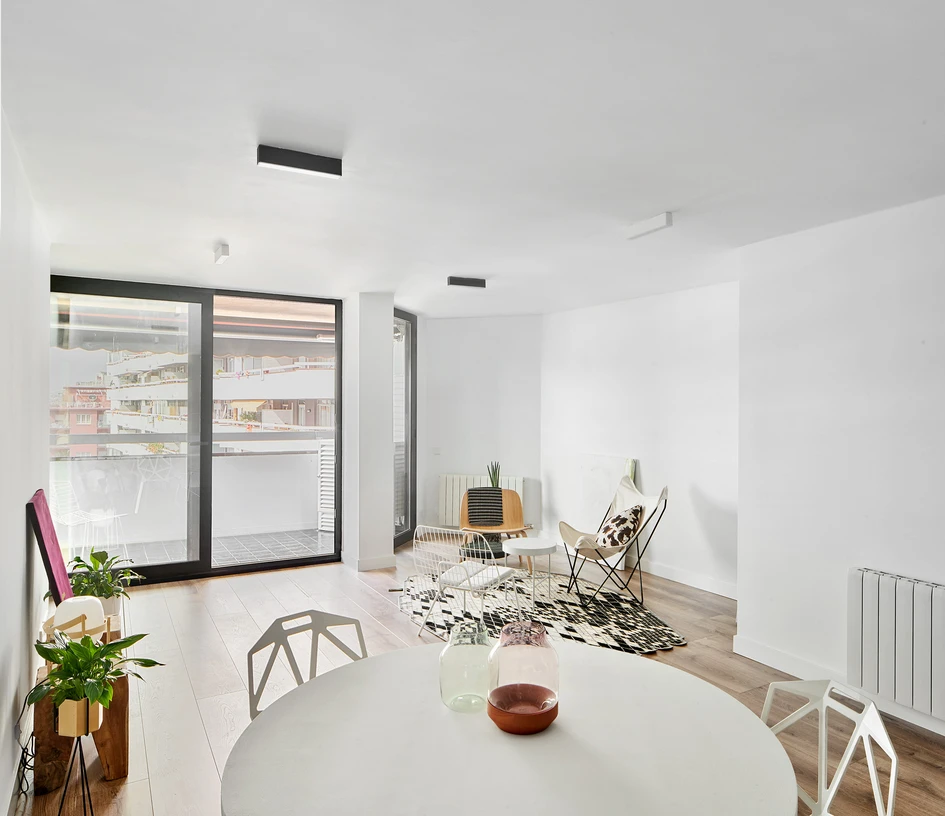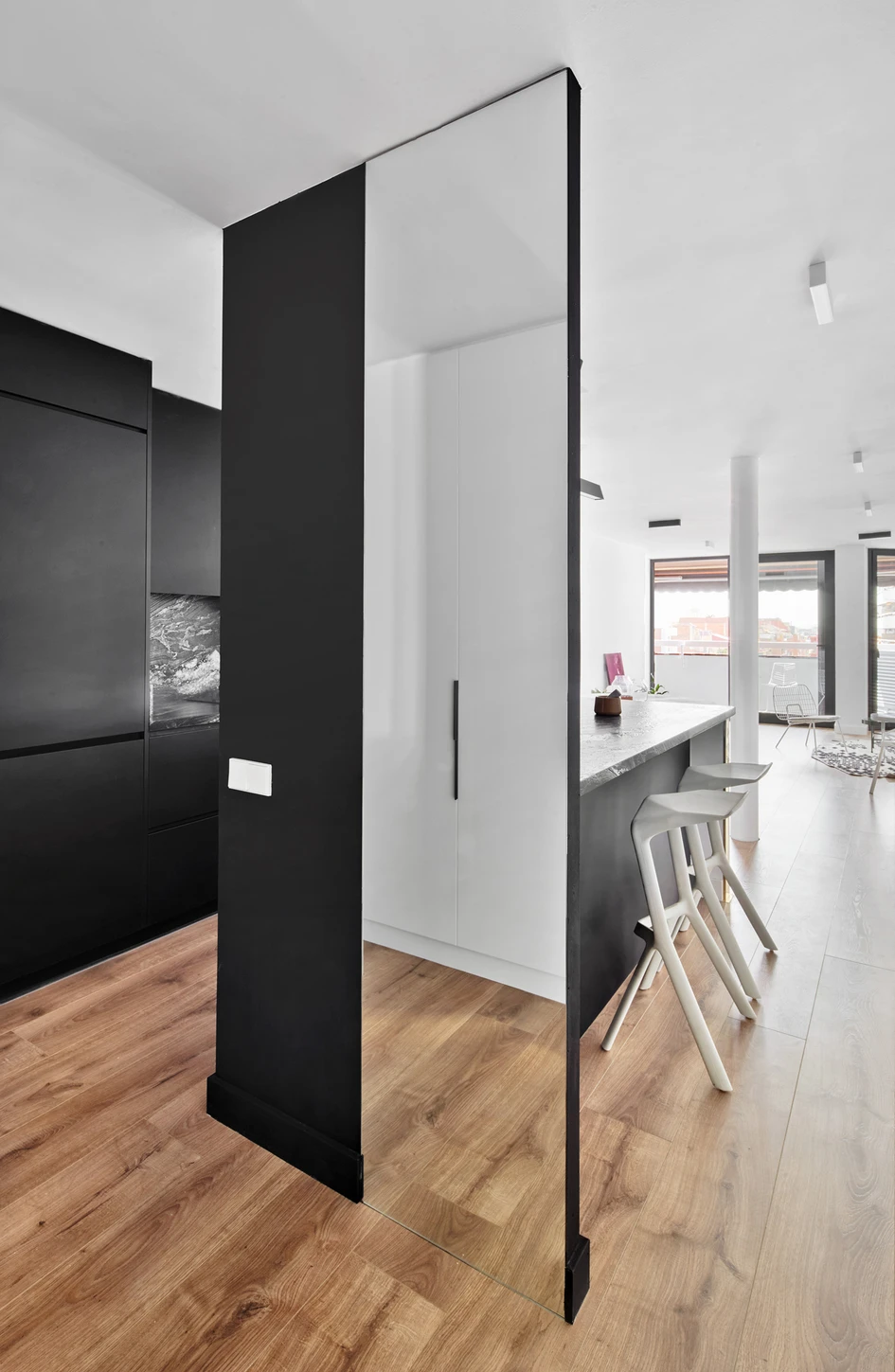 This spatial treatment of blurring the boundaries is the same as that of the areas of the two L-shaped elements mentioned above: the kitchen is focused towards the entrance, but at the same time it is separated from it with an independent partition, cladded with a large mirror that blurs the narrowest passage to the kitchen; and simultaneously it opens into the living room through an island that exceeds its limits. Likewise, the bedroom has been undone in several rooms; the anteroom of the same is the study area, communicated with the bed area (separated by the sliding glass doors but communicated by the top of them), and the bathroom is accessed from the bed area, this space more secluded and private.