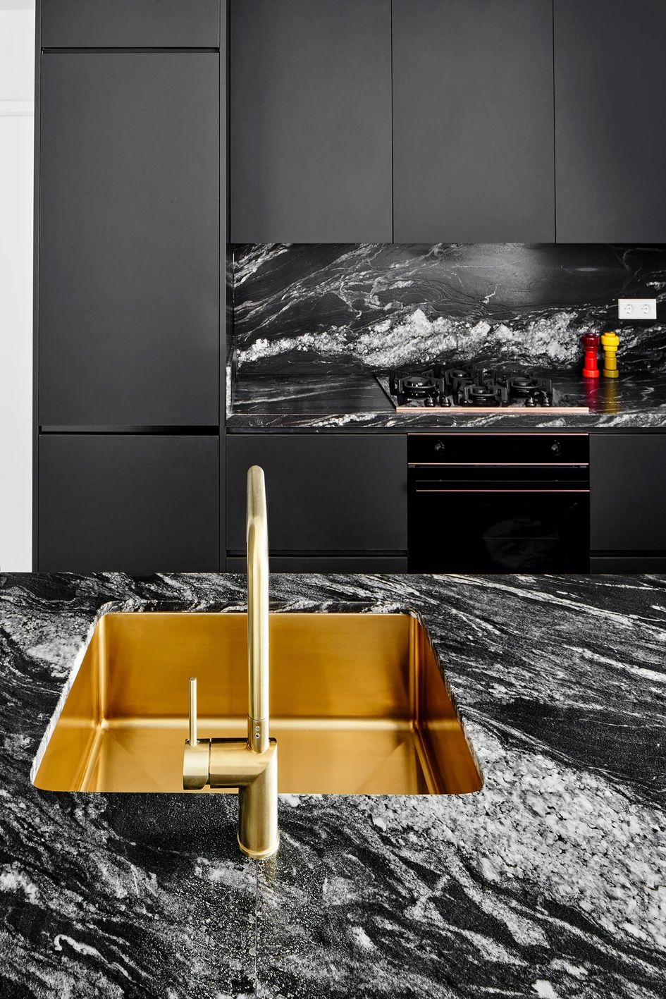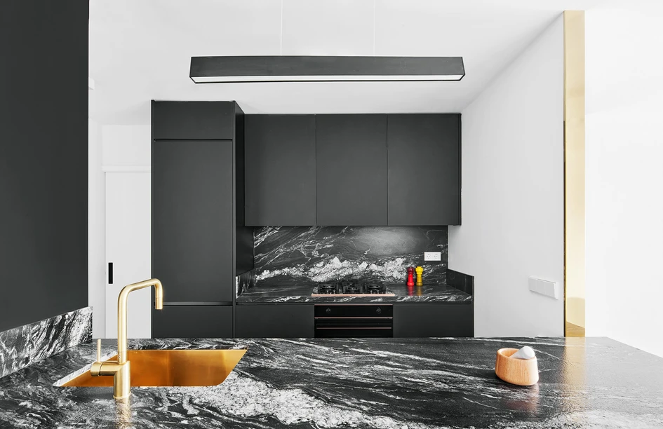 The material treatment accompanies the spatial concept, insinuating the position of each use in rooms that otherwise have no defined boundaries. Although the kitchen is housed in a more or less recognizable room, its color is black, and golden details in brass (the faucet, the sink) contrast the black surfaces; the large pivoting doors of the guest rooms are lacquered in black, and their handles again in brass, highlighting the interruption of the white walls; the bathroom suite is completely black, a mix of ceramic, granite, microcement and black varnish, and with taps, sinks and other accessories all in black. On the contrary, the guest bathroom has the opposite treatment, here the granite, the microcement and the varnish are all white, although the wash basin and faucets are kept in black. The sliding and pivoting doors of iron and glass draw figures that blur the axes, but also mark areas of privacy and more visible areas.