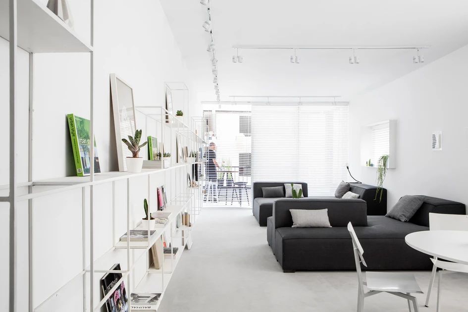 The public space includes the kitchen, living room and sun terrace. The public space is mostly monochromatic and so we have designed 3D elements which provide an extra dimension to the space. Along the living room kitchen wall, we designed an 8 m minimalist white iron library its depth is 20 cm only and display design books, magazines and artwork as displayed in galleries.We framed the living room window using a white thin iron frame and decorated it with plants & accessories.