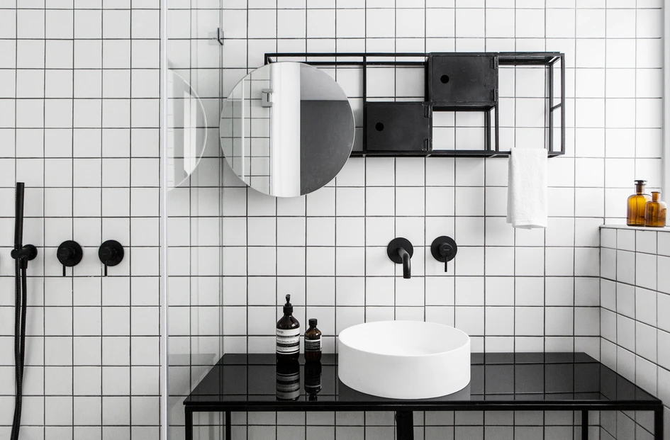 The bathroom was covered with black and white grid tiles. luxurious shower & round white corian sink was placed on top of black glass & perfectly integrated with the minimalist black and white grid. A black iron facilities storage for daily care products and a round mirror were hung over the sink.
