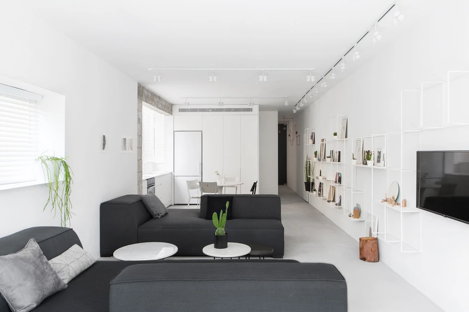 The entire floor of the apartment was covered by a concrete micro-toping layer. The apartment entrance cross the apartment to two. public space on the left and private spaces to the right.