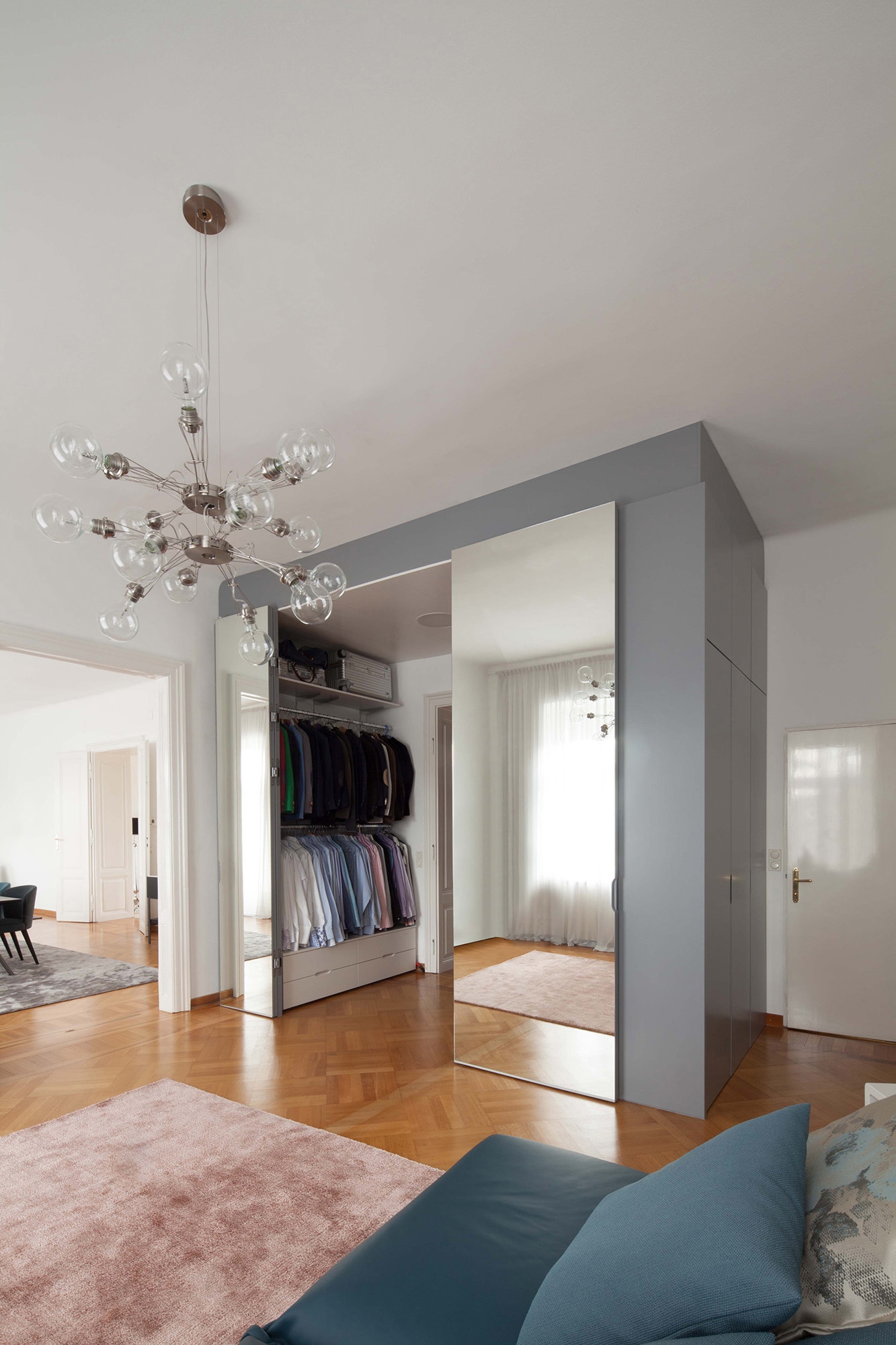 This Beletage apartment occupies the entire first floor of a beautiful villa in Vienna’s 19th district and was completely redesigned. Since it is a rented property, structural changes were hardly possible. Only a new cabinet stands like a monolith in decent grey between bedroom and guestroom. By opening two huge doors, which are mirrored on the inside, the guest room can be transformed into a stately dressing room in no time. The entrance area, the central dining room and study, the living room, and the bedroom were furnished with high-quality and predominantly Italian products. The colour concept, with its light grey, blue, and sand tones is tailored precisely to the client’s wishes.