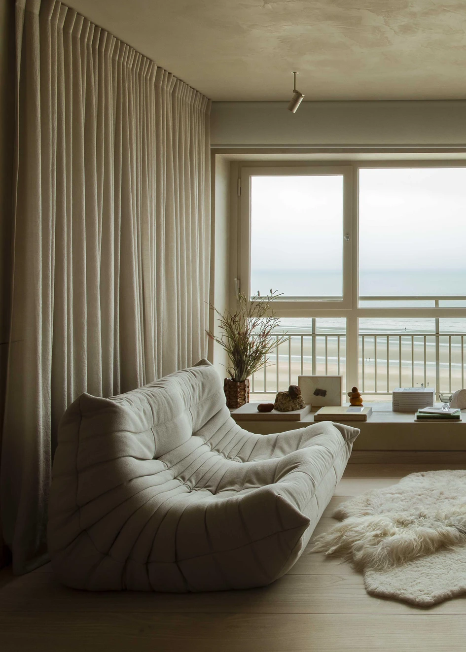 Onto the play of light and shadow. Since the 1950s building does not face the sea, but has a slight bend in its orientation towards the sea, daylight from the north does not enter directly, but diffusely or softly. Furthermore, candlelight was integrated in the lighting plan to create atmosphere. It makes time slip away in this weekend retreat. The apartment is a place to de-connect from outside and connect with whoever you share the space with.