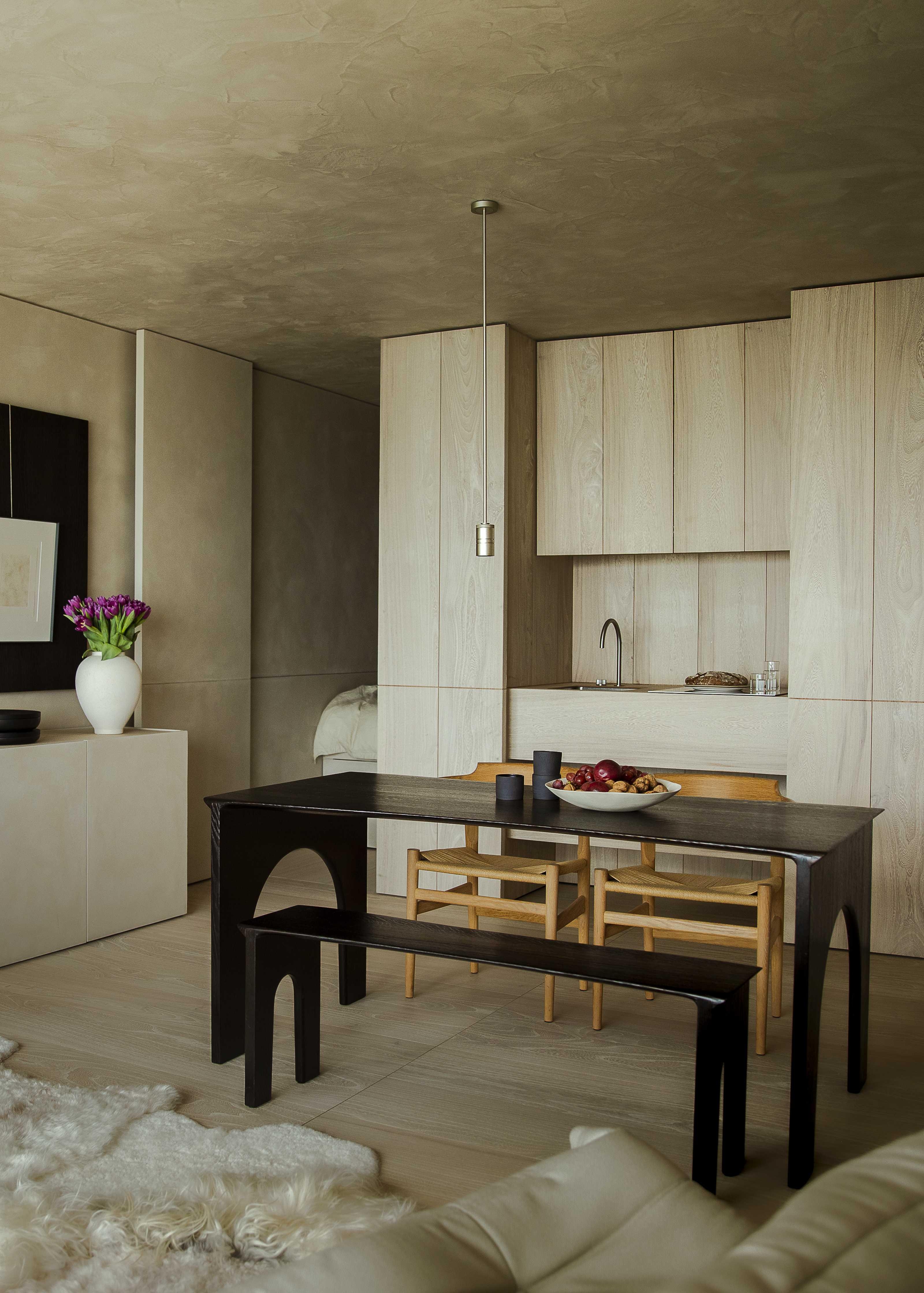 The unity and natural flow in the apartment were further enhanced by reducing the variety of materials and colours to a minimum. For instance, the bleached elm of the parquet thoughtfully recurs in the kitchen worktop and the black of the table by studio Lukas Cober is also reflected in the monochrome anthracite bathroom. The design selection consists of personal favourites. From fine-grained, stainless steel bespoke furniture to the soft curves of Ligne Roset's iconic Togo: a delicate balance between straight lines and curves on the one hand and soft and rough textures on the other was also sought in the choice of furniture.
