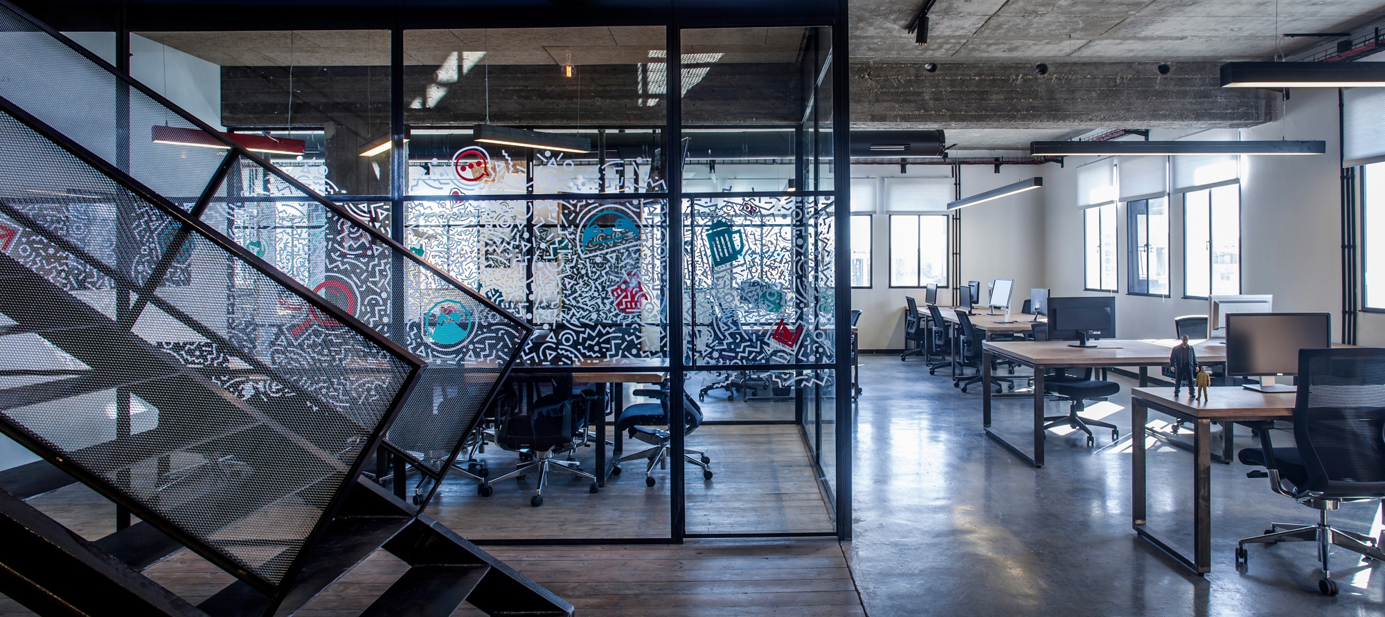 The connection with the upper floor is done with the use of a pedantic designed industrial staircase made of natural iron and expanded net. The materials were specially chosen in order to accentuate an architectural discourse dictated by industrial and lo-fi design elements. The iconic staircase leads to the patio where one can find the kitchen and bar, accompanied with an outdoor seating area perfect for taking a break and enjoying panoramic views of downtown Tel Aviv.