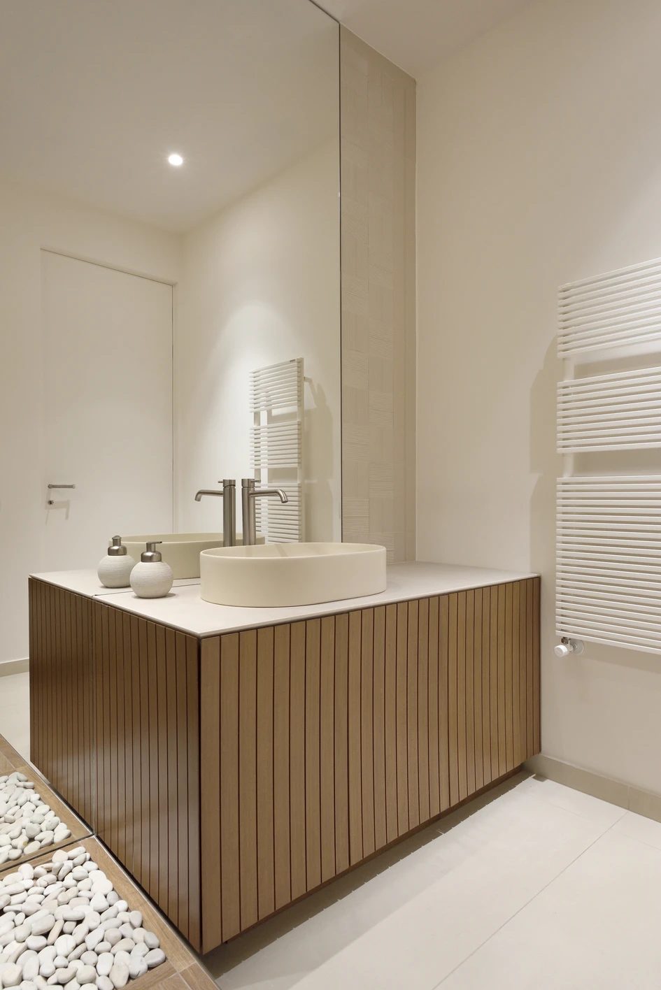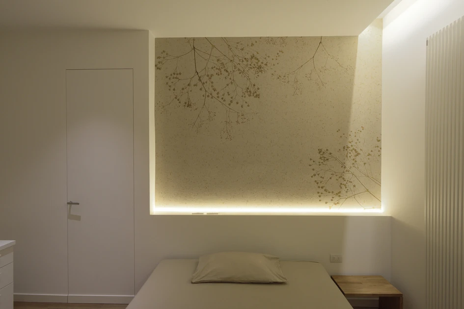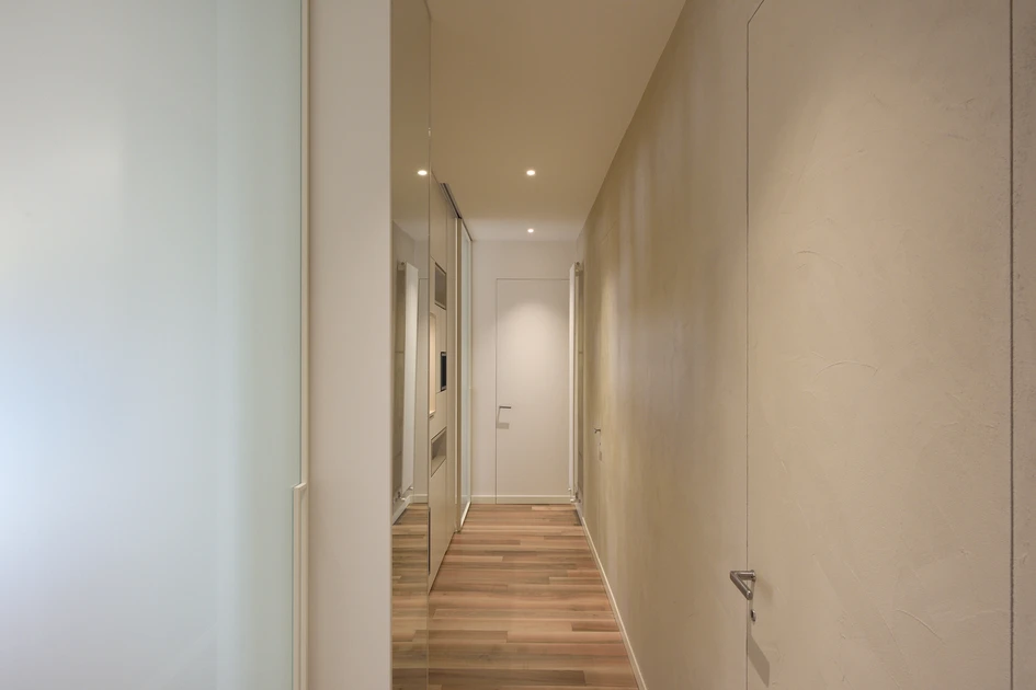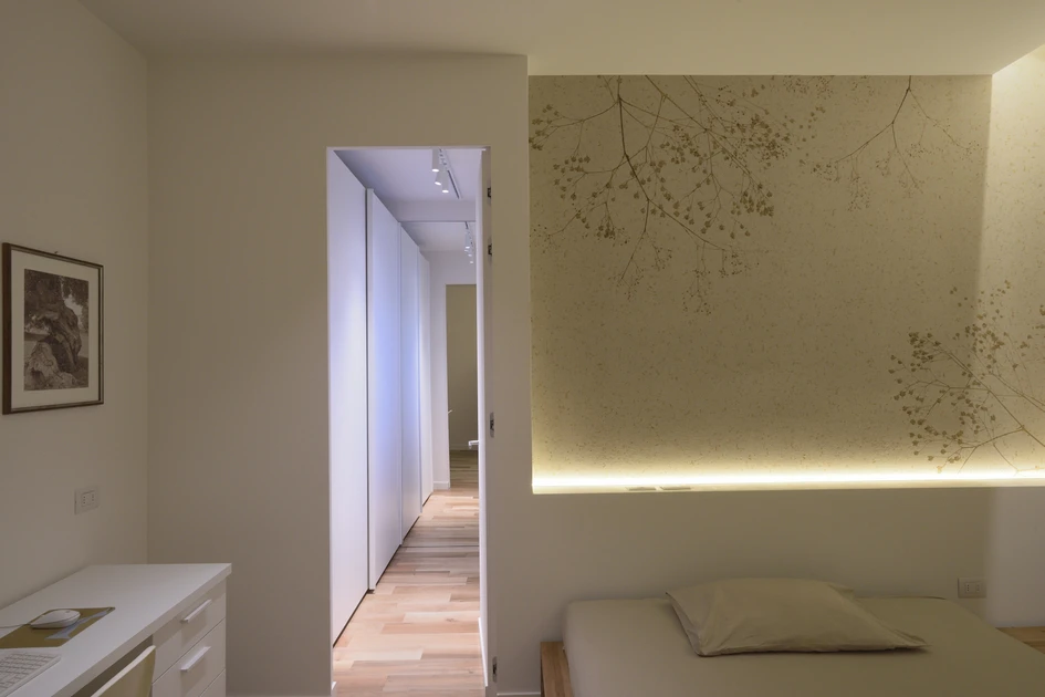 The moodboard, chosen in close dialogue with the client, translates into concrete terms the essence and personality of the people who inhabit these spaces. The result is a perfect balance between warm textured tones, emphasised by the brushed national walnut parquet, and the cool, highly refined tones of the lighting and furnishing elements. Smooth surfaces in magnolia white, reminiscent of flowers in outdoor gardens, alternate with highly textured surfaces. These, distinguished by lime plaster, characterise the walls of the corridor and the living room, while the bathrooms feature three-dimensional cladding, emphasised by the use of cascade lighting. Natural walnut wood is also used in the custom-designed fixtures, such as bathroom furniture and boiserie.