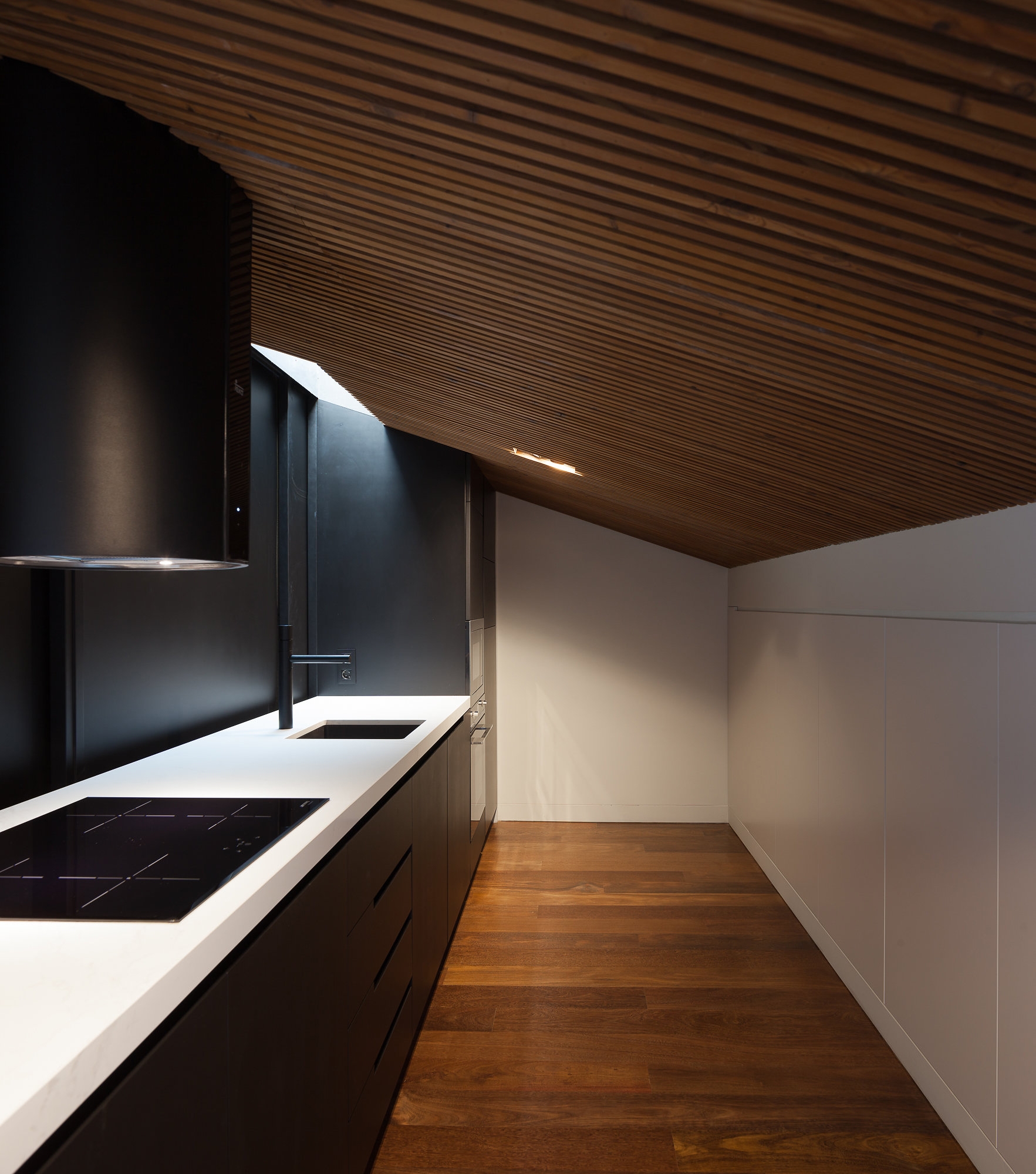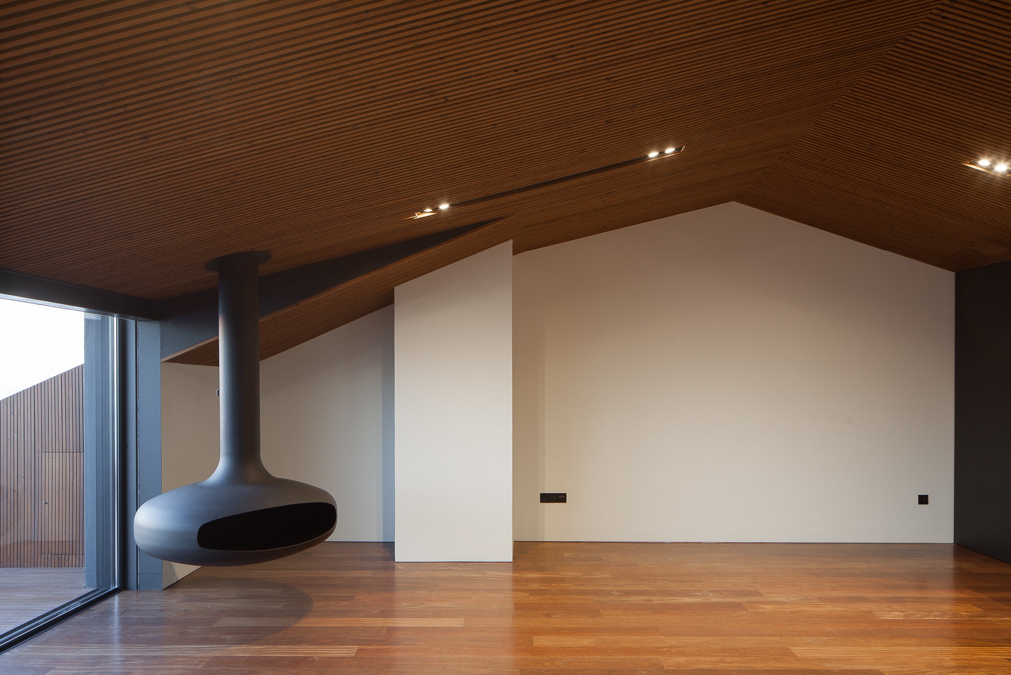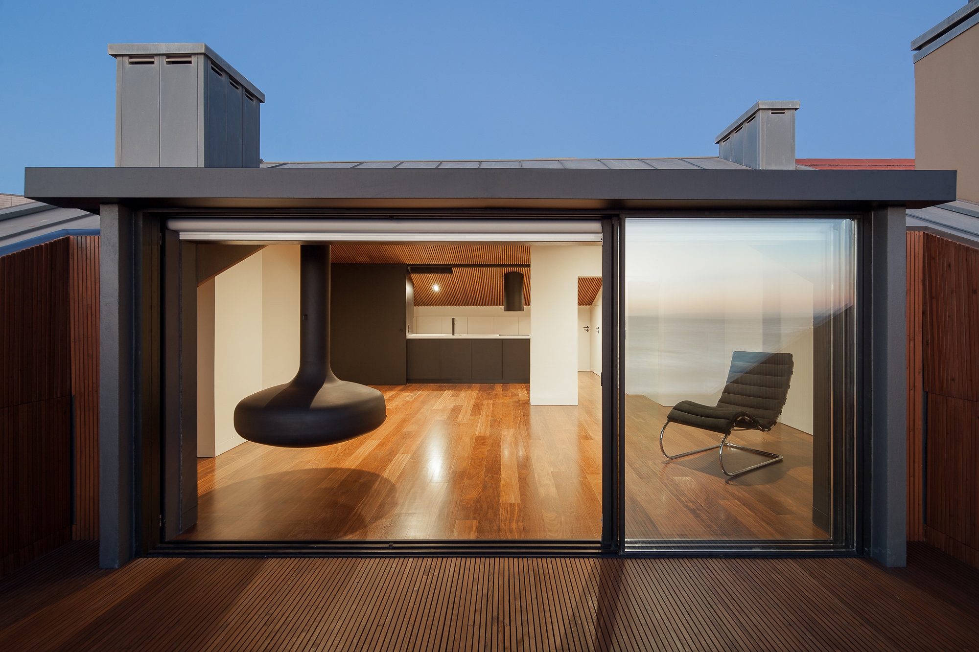 1970s Apartment Renovation. Located in Foz do Douro, Porto. The project aimed to enhance the unobstructed view of the Atlantic Ocean, increasing the permeability between the interior and exterior, through wide windows with full opening. The intensive use of the wood in the interior floors and ceilings and in the exterior walls and floors was based on a nautical inspiration provided by the location.