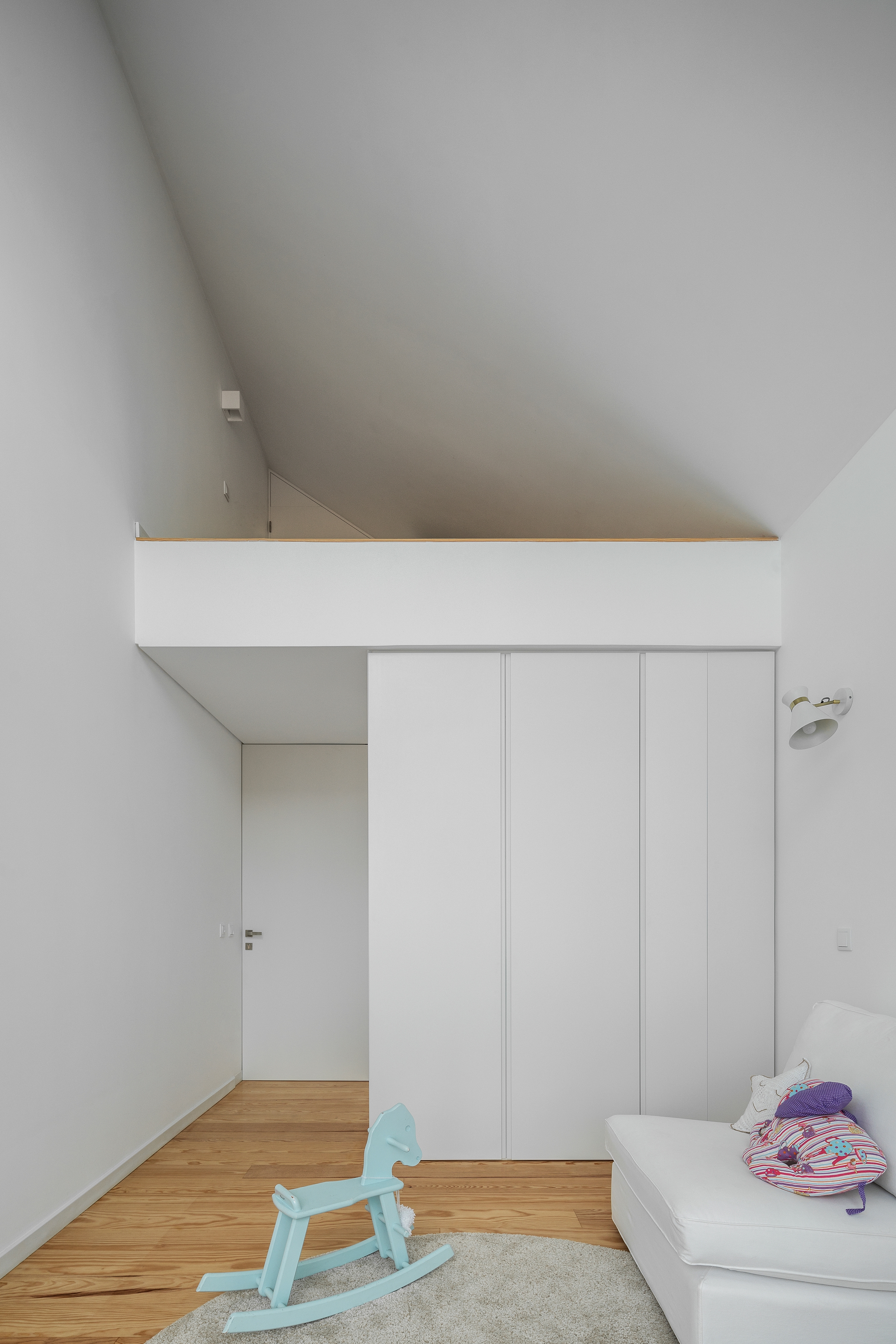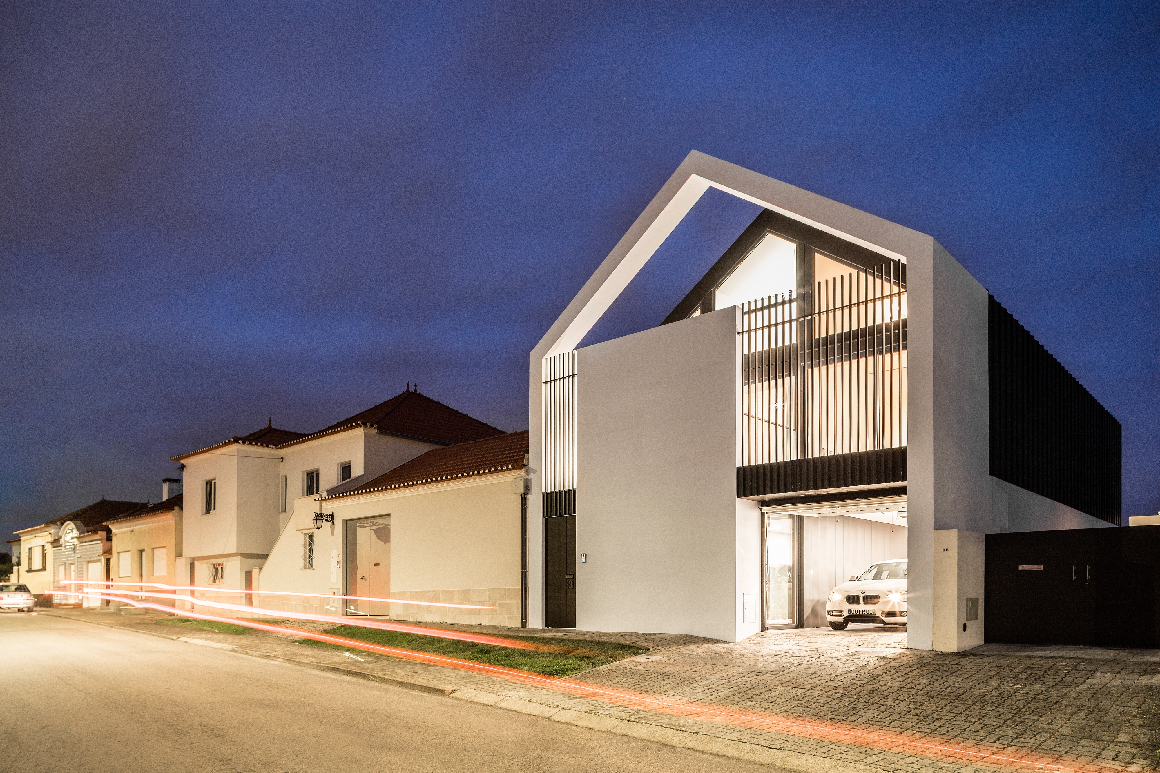 The Arch House follows the continuity of the neighbour buildings, with the main facade ensuring the alignment with the consolidated pre-existence. However, it is stylized to allow the permeability of light and views, in a symbolic game of association with the presence of the Arch, which marks the entrance to the place of Vista Alegre. This debugging work creates the "crowning" of this facade, and assumes itself as a drawing of any child - My house!