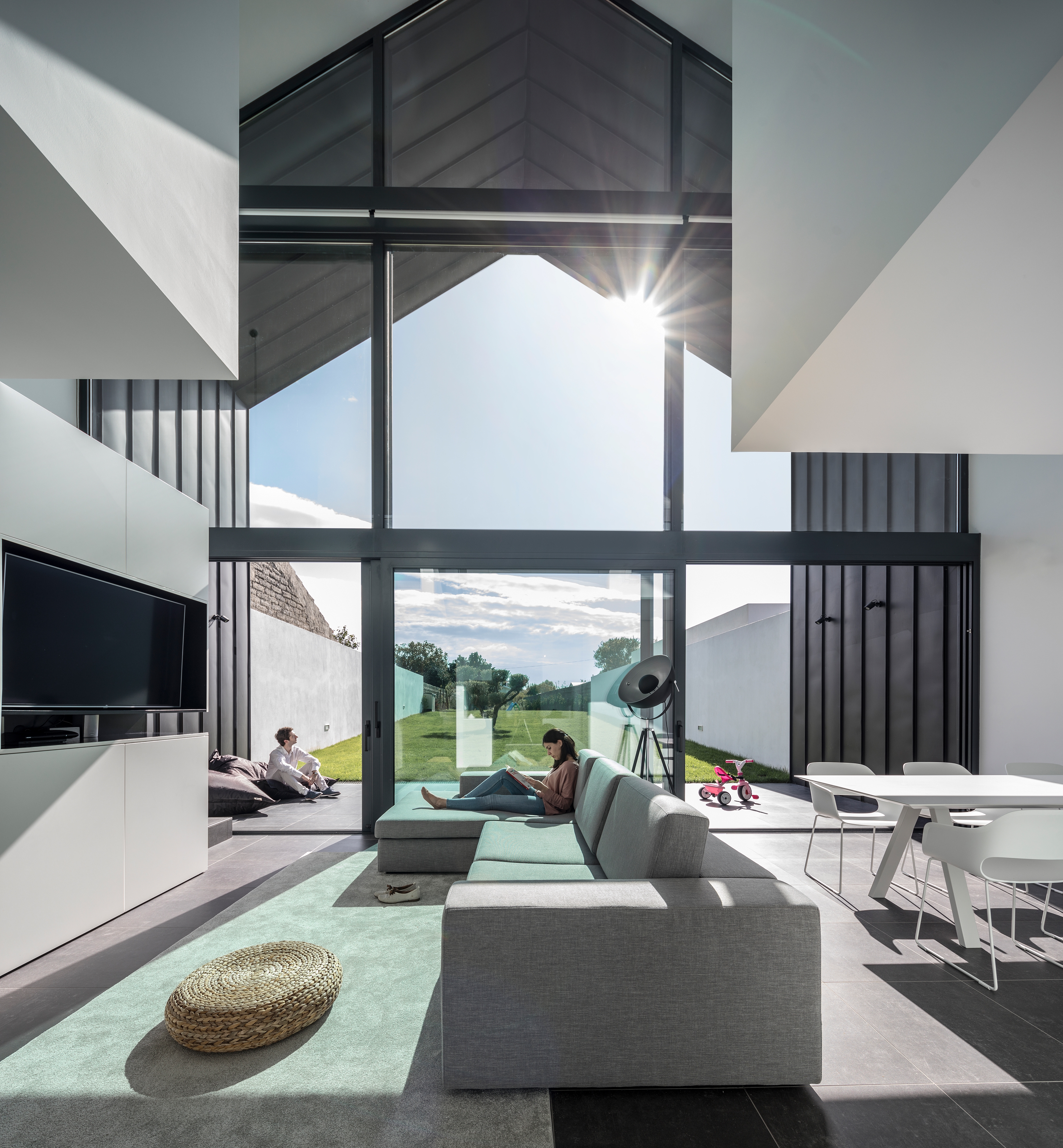 It was important for the architect to guarantee this process of transition from the public to the private, as well as ensuring adequate privacy in the interior, because of the maximum exposure desired. Inspired by ship containers, the volume set with which the interior is developed, creates a total height in some areas, recreating the great industrial environment of a main ship. This set of different roof heights widens the spaces and makes them more comprehensive, providing a visual relation between the various places in the house.