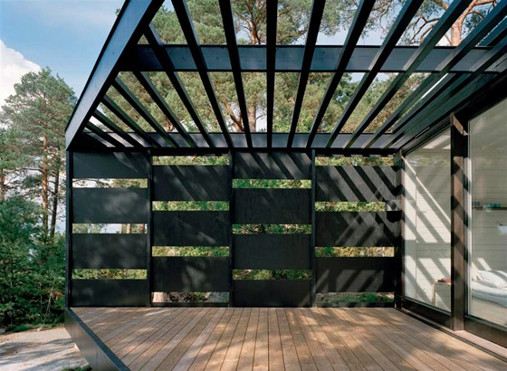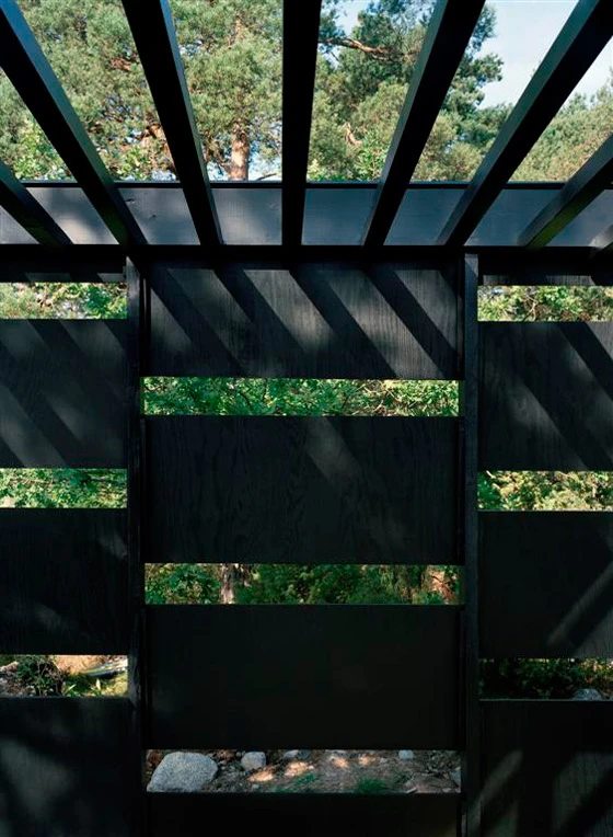 The horizontal character of the black-stained exterior relates to the verticality of the island’s tall pines, and mirrored views of the Baltic Sea. The geometry of the plan is generated by the specifics of the site; the house sits on a flat surface between two rocky outcrops, and is oriented simultaneously towards the sun in south and towards sea views in the west. With smaller rooms placed behind, the three large social areas of the house open up to the terrace and provide an open platform, criss-crossed by sliding glass. The zigzag layout also creates a series of outside spaces which are sheltered from the island’s strong winds. As a result of the large glass panes and the prevailing conditions of light, reflections and mirror-like effects, a quality is created where nature, space and horizon all interact together. A horizontal screen diffuses sunlight and provides a variety of shadows, as well as giving the impression of a continuous space, blurring the boundary between inside and out.
