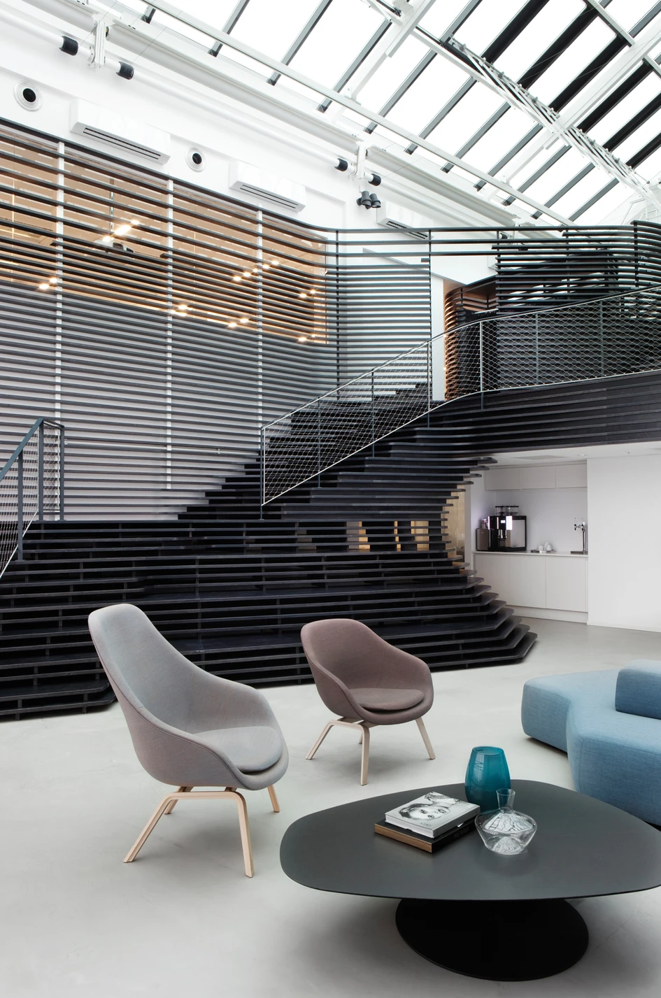 The office is entered on the top floor. A new reception “sculpture” incorporates back offices, reception desk and a large stair/amphitheatre that straddles a double height space. The design is inspired by “svabergs”, large granite stone formations that are typical for the area, rounded and polished by icebergs thousands of years ago.