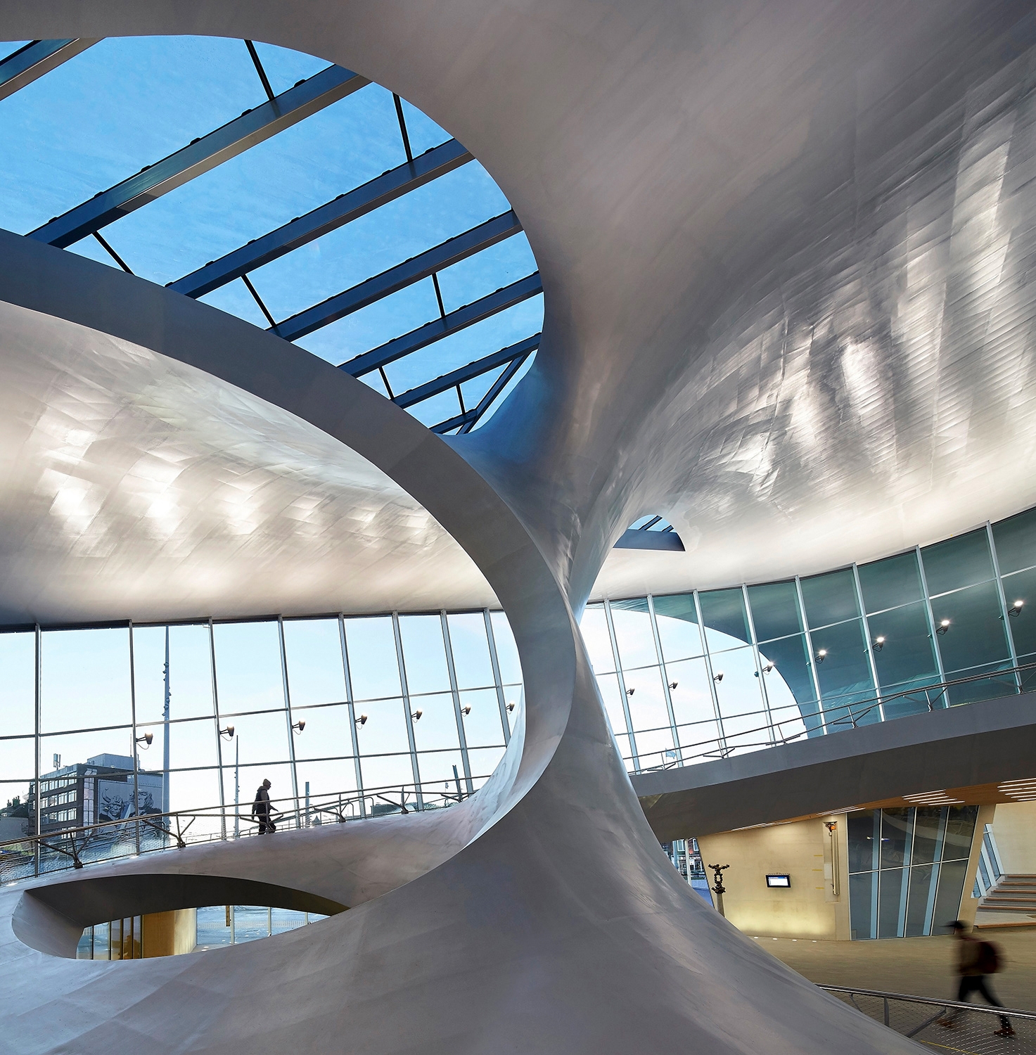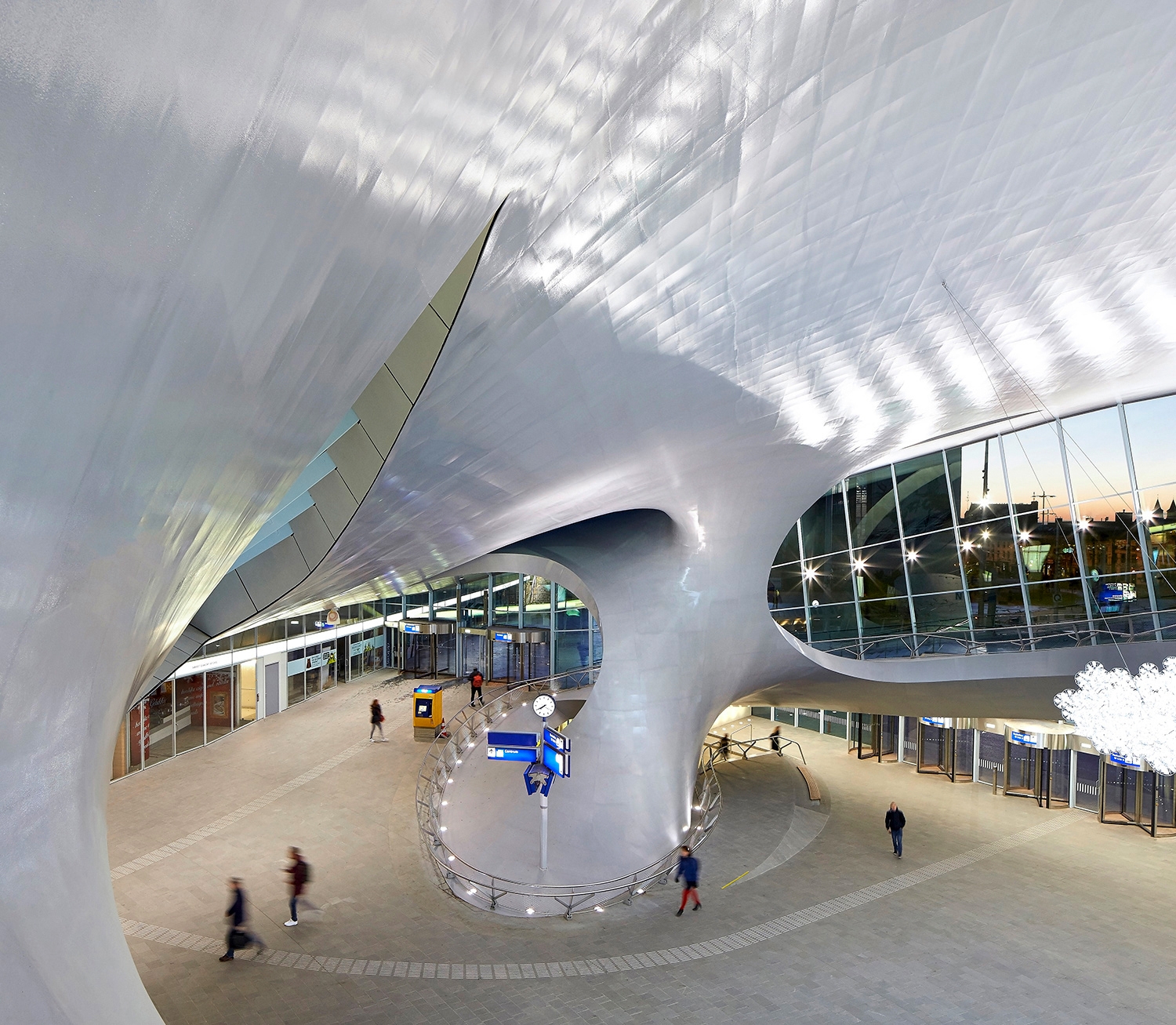 The 21,750m2 Transfer Terminal features a dramatic twisting structural roof geometry, which enables column-free spans of up to 60m in the transfer hall. Taking references from the continuous inside/outside surface of a Klein Bottle, UNStudio aimed to blur distinctions between the inside and outside of the terminal by continuing the urban landscape into the interior of the transfer hall, where ceilings, walls and floors all seamlessly transition into one another. The structure of the roof and twisting column was only made possible by abandoning traditional construction methods and materials; much lighter steel replaced concrete – originally intended for the station – and was constructed using boat building techniques on a scale never before attempted.