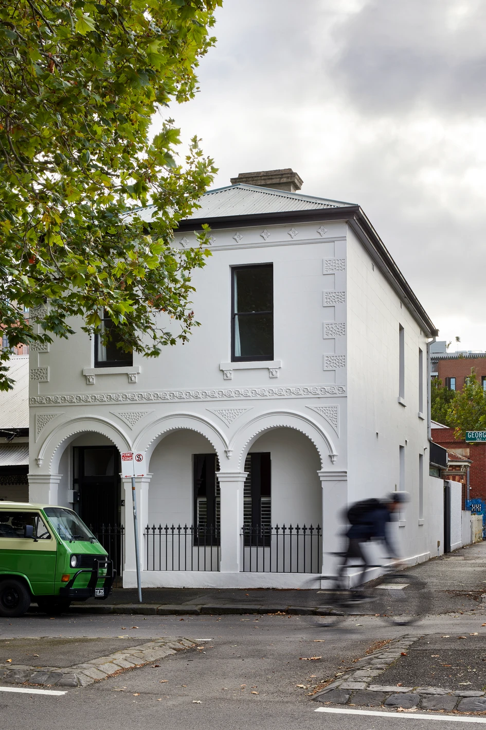 Upstairs the front two rooms were turned into a wide main bedroom with a both sleeping and a relaxation zones. Both of the grand Victorian front windows that overlook the street now belong to this room giving it a European apartment feel. A soaring walk in robe and a skylit en suite are tucked in behind.