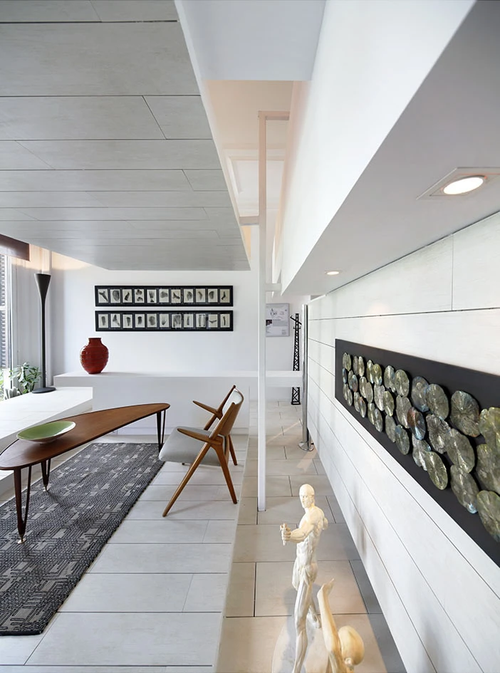 The result is the power to move around in few square meters at different heights, going up and down, offering a new experience of roominess in the context of a home: to explore the space. The transition between the rooms is continuous and lets the movement flow freely across the numerous levels.