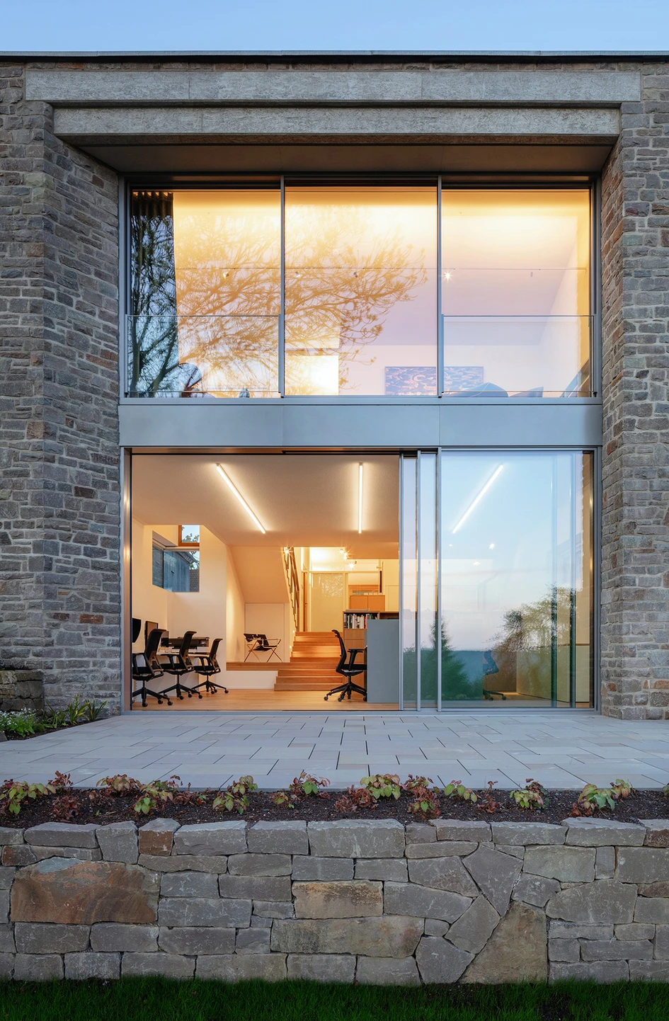 The outer walls were built using greywacke for a natural stone look. All the joinery was completed using oakwood. Quarry-stone and wood have a long local tradition as construction materials, but the contemporary architectural approach gives them a modern twist.For the large glass front on the garden side, the architects deliberately chose a very different approach in terms of materials. “We wanted to make a large panorama opening to provide the perfect view of the natural surroundings,” explains Bork Schiffer, Project Manager at Nebel Pössl architects’ bureau. “To achieve this, we needed an ultra-slimline window construction that could be opened up in summer. The Solarlux cero III sliding window ticked all the right boxes for the project.