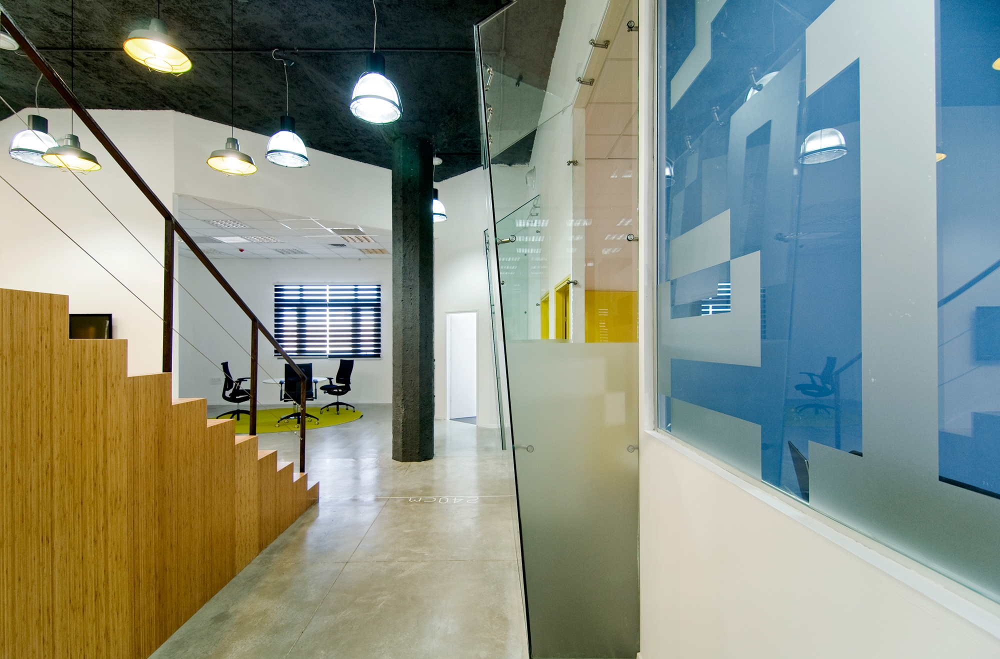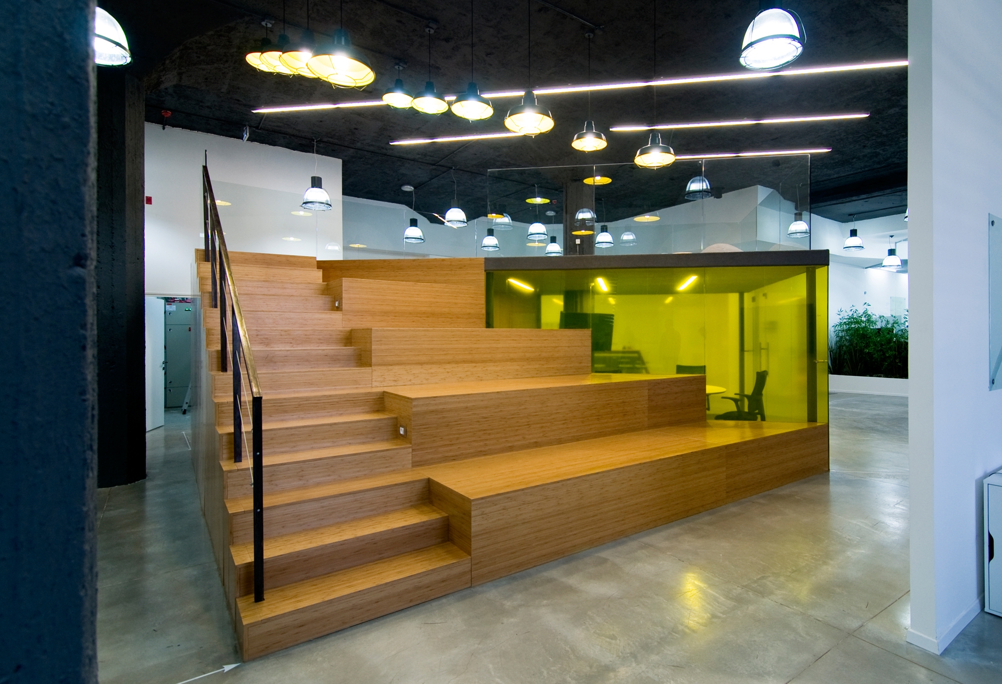 An open space terrace platforms that enables, a view towards the office and main window while working. It emphasize its 3D, by being an object with divers angles and heights, that allows the employees to move through and around it. It is used by local management in different ways for productivity as well as giving the employees their own special work space.