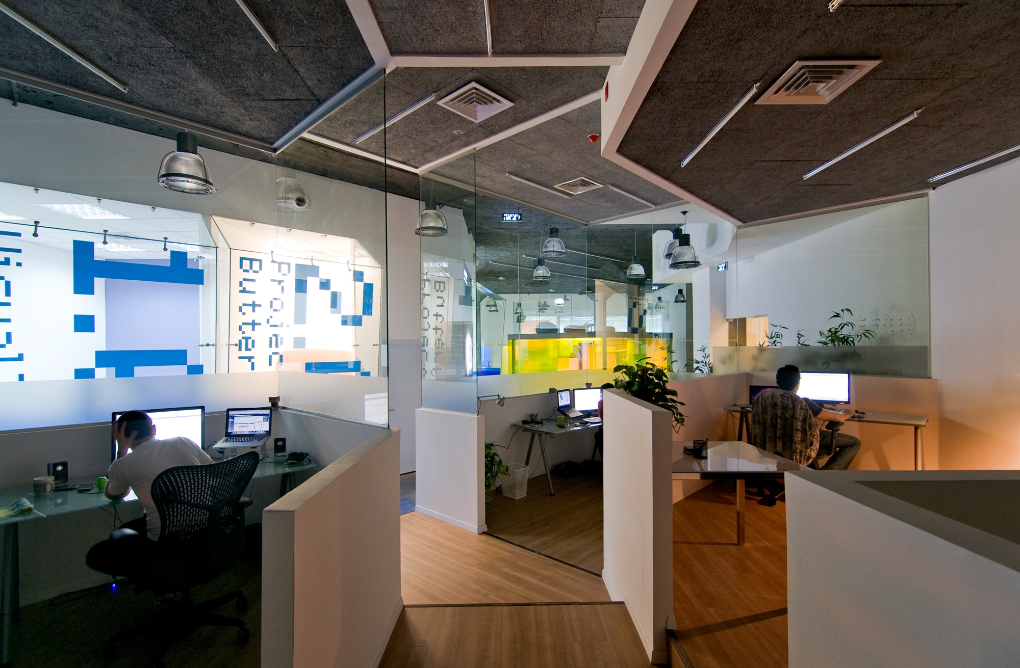 The 3d multi-material object, is made out of steel, glass, wood and fabric. It enables movement around, within and on top of it. The space offers a place to work and take a break. It includes a meeting room, video games lounge, ministand for lectures/gatherings and a relaxation roof top space, that enables a view of the entire office.