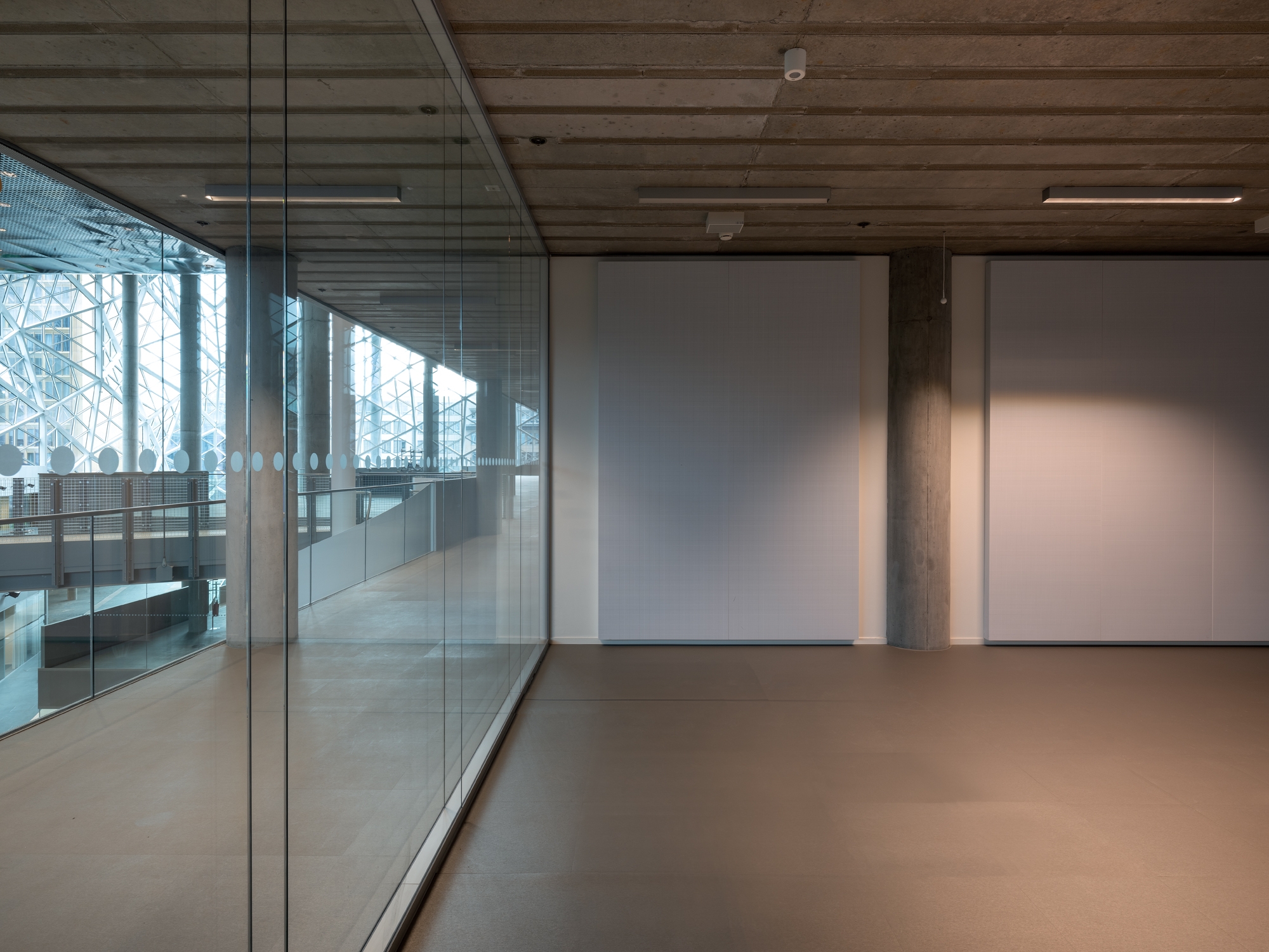 Glass partition walls from Strähle are used both in the atrium and in all office areas. Flooded with light, the atrium is secured by means of anti-fall glass walls and ensures some pretty spectacular views out onto the striking façade of the building. Depending on noise insulation requirements, the all-glass walls of the System 3400 and System 3500 are available with either single or double glazing. With no vertical profiles, both systems offer maximum transparency and their design has been minimalistically reduced. In the office areas, various room types were created in order to ensure flexible use in the long term.