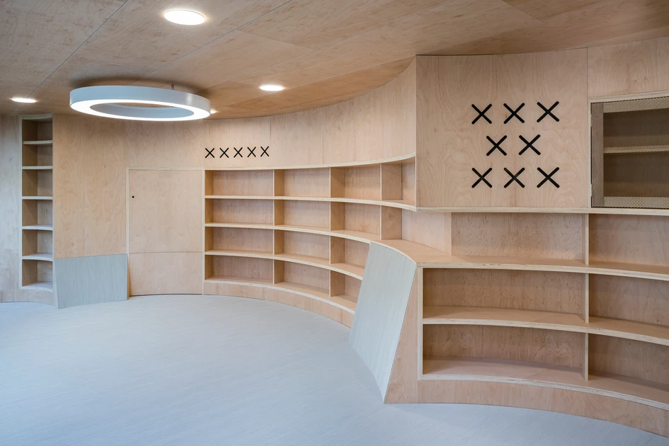 Similarly to the Historic Archive, rooms are completely wrapped in warm maple wood: the architects used curved wooden walls to integrate shelvings and some openings to hidden spaces behind, such as a wardrobe and a puppet theatre.