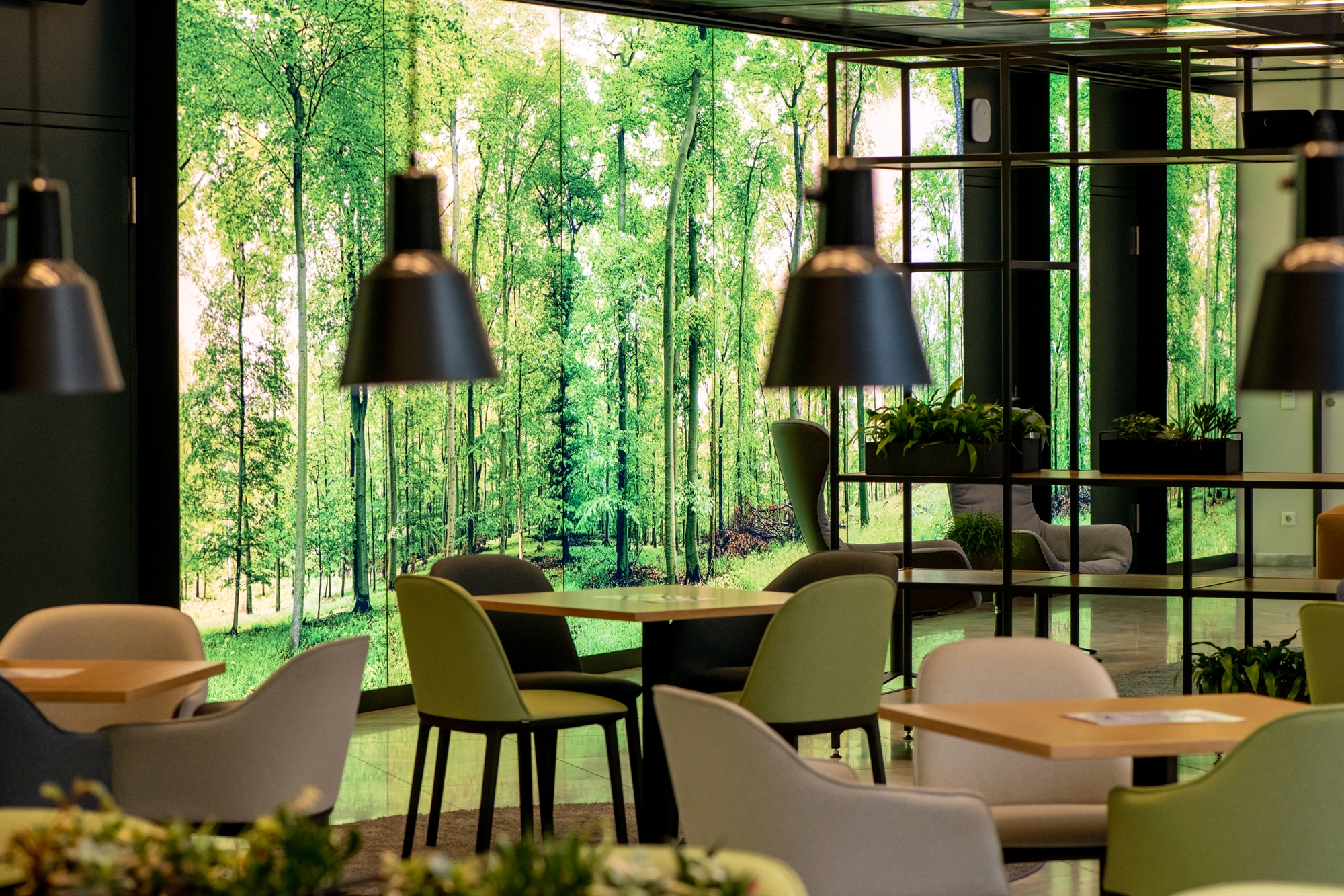 endlight used an LED lightpanel with printed motif across the entire width and height of the room. The forest motif creates a feeling of nature other than that urban space.