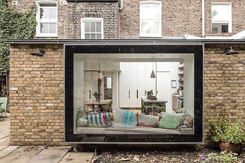 The kitchen space is formed by a single pitched roof with large patent glazing skylight. We sought to make the ceiling as high as possible to maximise the sense of light and space. On the garden side, we introduced a generous window seat with an oversized piece of glass framing a view into the garden. There is a bathroom above the kitchen at the half landing of the stair.
