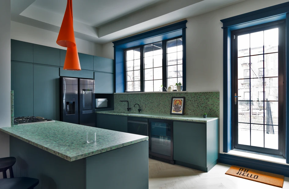 Just like the bookcase, the custom-made kitchen brings in an artisanal touch to the project, making it exclusive and timeless. Developed along four sides, it was manufactured with clean details and painted to obtain an impeccable matte petrol green in Turin and it features state-of-the-art appliances and durable, elegant interior finishes of the cabinets. The unique terrazzo tops and backsplashes are made of a special composition of concrete and color engineered and manufactured in Verona. The orange pendants above the counter are knotted together suggesting an idea of warmth lightness.